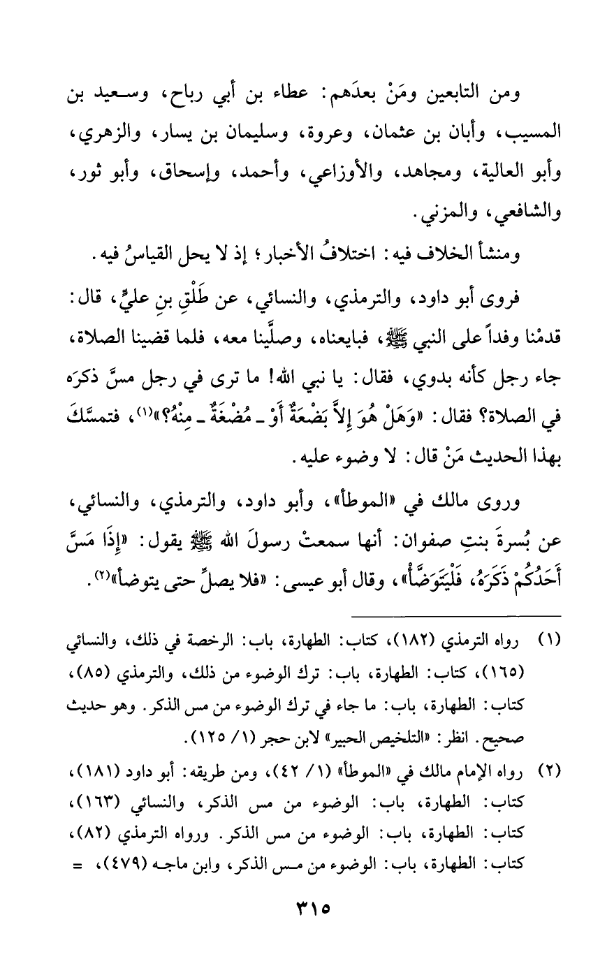 (¬1) رواه الترمذي (182)، كتاب: الطهارة، باب: الرخصة في ذلك، والنسائي (165)، كتاب: الطهارة، باب: ترك الوضوء من ذلك، والترمذي (85)، كتاب: الطهارة، باب: ما جاء في ترك الوضوء من مس الذكر. وهو حديث صحيح. انظر: «التلخيص الحبير» لابن حجر (1/ 152).