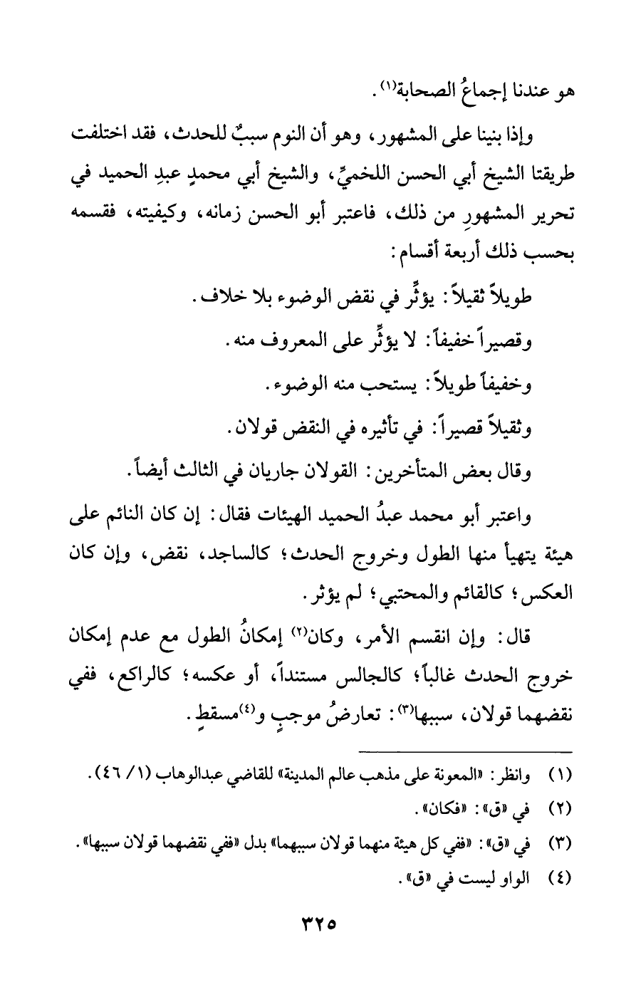 وإذا بنينا على المشهور، وهو أن النوم سبب للحدث، فقد اختلفت طريقتا الشيخ أبي الحسن اللخمي، والشيخ أبي محمد عبد الحميد في تحرير المشهور من ذلك، فاعتبر أبو الحسن زمانه، وكيفيته، فقسمه بحسب ذلك أربعة أقسام: طويلاً ثقيلاً: يؤثر في نقض الوضوء بلا خلاف، وقصيرا خفيفًا: لا يؤثر على المعروف منه.
