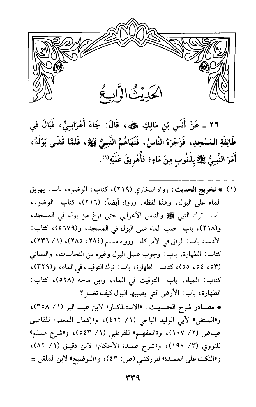 26 - عَنْ أَنَسِ بْنِ مَالِكٍ - رضي الله عنه -، قَالَ: جَاءَ أَعْرَابِيٌّ , فَبَالَ فِي طَائِفَةِ الْمَسْجِدِ , فَزَجَرَهُ النَّاسُ , فَنَهَاهُمُ النَّبِيُّ - صلى الله عليه وسلم -، فَلَمَّا قَضَى بَوْلَهُ، أَمَرَ النَّبِيُّ - صلى الله عليه وسلم - بِذَنُوبٍ مِنْ مَاءٍ؛ فَأُهْرِيقَ عَلَيْهِ (¬1).