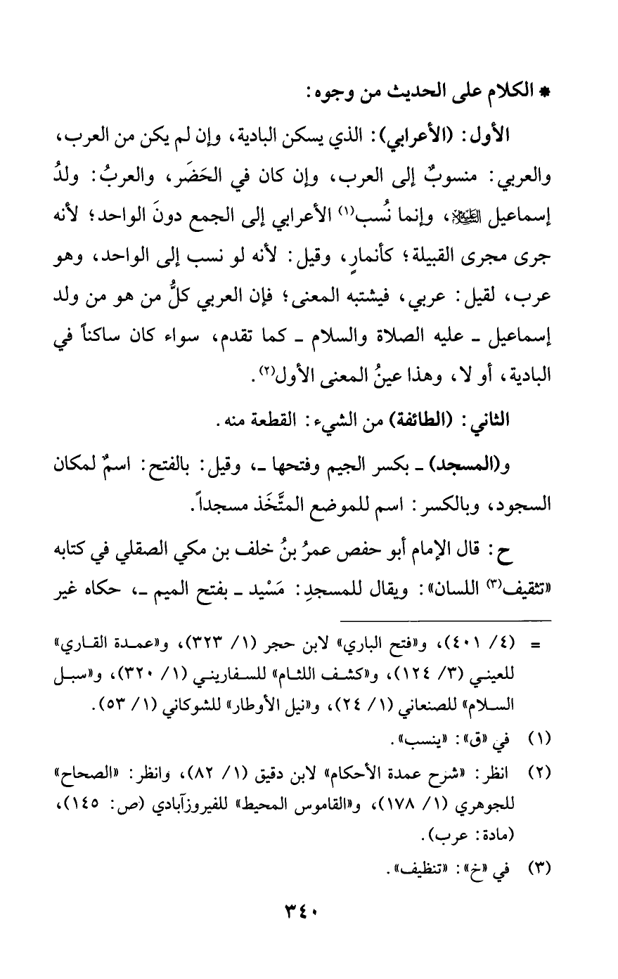(¬2) انظر: «شرح عمدة الأحكام» لابن دقيق (1/ 82)، وانظر: «الصحاح» للجوهري (1/ 178)، و «القاموس المحيط» للفيروزآبادي (ص: 145)، (مادة: عرب).