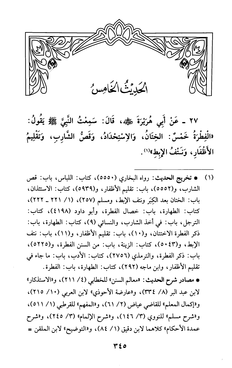 27 - عَنْ أَبِي هُرَيْرَةَ - رضي الله عنه -، قَالَ: سَمِعْتُ النَّبِيَ - صلى الله عليه وسلم - يَقُولُ: «الْفِطْرَةُ خَمْسٌ: الْخِتَانُ , وَالاسْتِحْدَادُ , وَقَصُّ الشَّارِبِ , وَتَقْلِيمُ الأَظْفَارِ , وَنَتْفُ الإِبِطِ» (¬1).