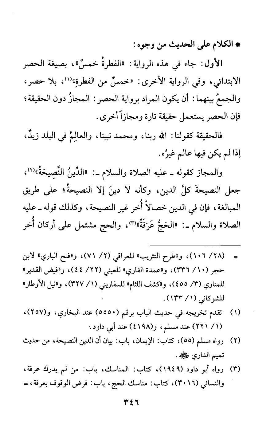 طريق المبالغة، فإن في الدين خصالاً أخر غير النصيحة، وكذلك قوله -عليه الصلاة والسلام-: «الحج عرفة» (¬3)، والحج مشتمل على أركان أخر
