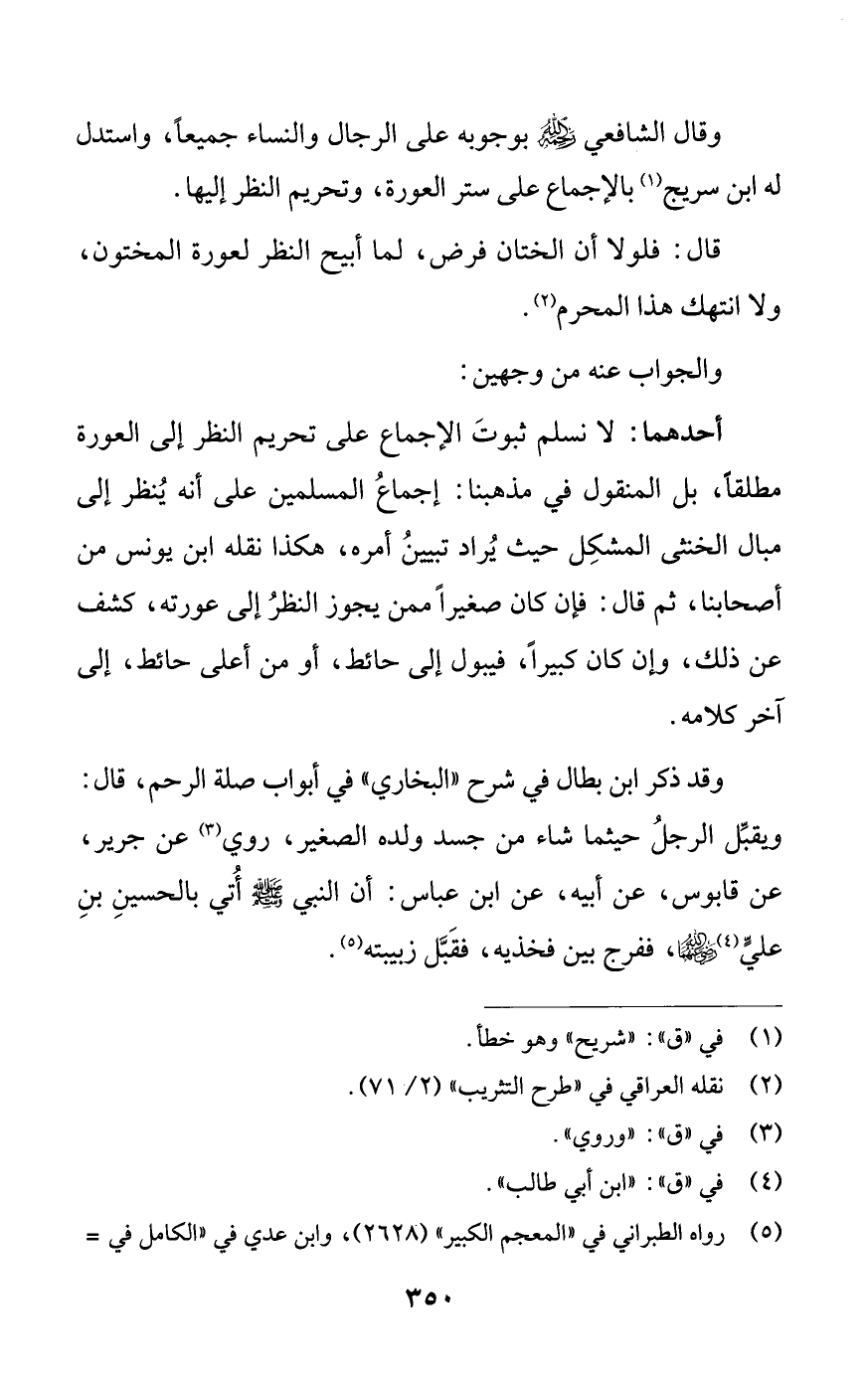 أحدهما: لا نسّلم ثبوت الإجماع على تحريم النظر إلى العورة مطلقًا، بل المنقول في مذهبنا: إجماع المسلمين على أنه ينظر إلى مبال الخنثى المشكل حيث يراد تبيين أمره، هكذا نقله ابن يونس من أصحابنا، ثم قال: فإن كان صغيرا ممن يجوز النظر إلى عورته، كشف عن ذلك، وإن كان كبيرا، فيبول إلى حائط، أو من أعلى حائط، إلى آخر كلامه.