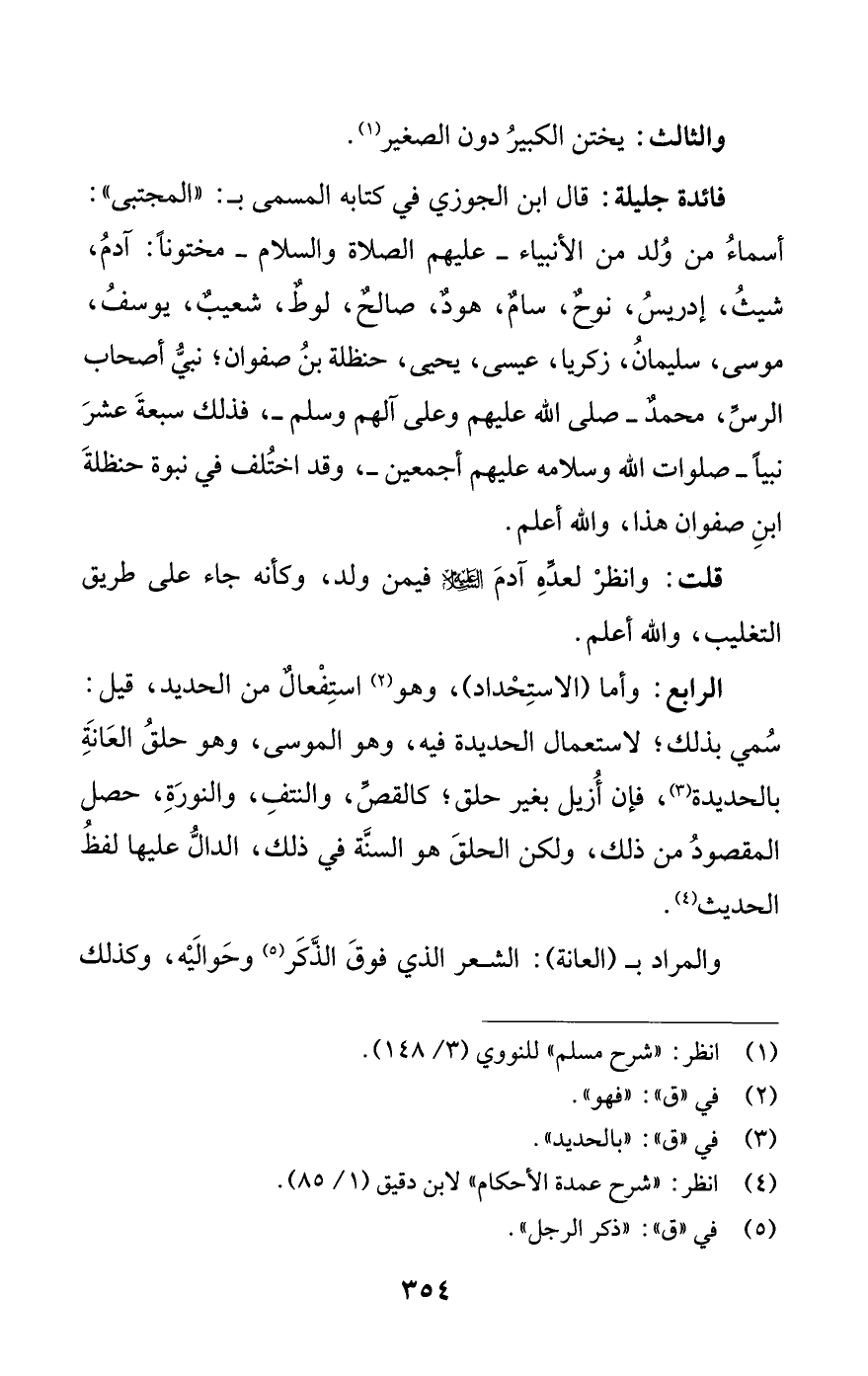 فائدة جليلة: قال ابن الجوزي في كتابه المسمى ب: «المجتبي»: أسماء من ولد من الأنبياء -عليهم الصلاة والسلام- مختونا: آدم، شيث، إدريس، نوح، سام، هود، صالح، لوط، شعيب، يوسف، موسى، سليمان، زكريا، عيسى، يحيى، حنظلة بن صفوان؛ نبي أصحاب