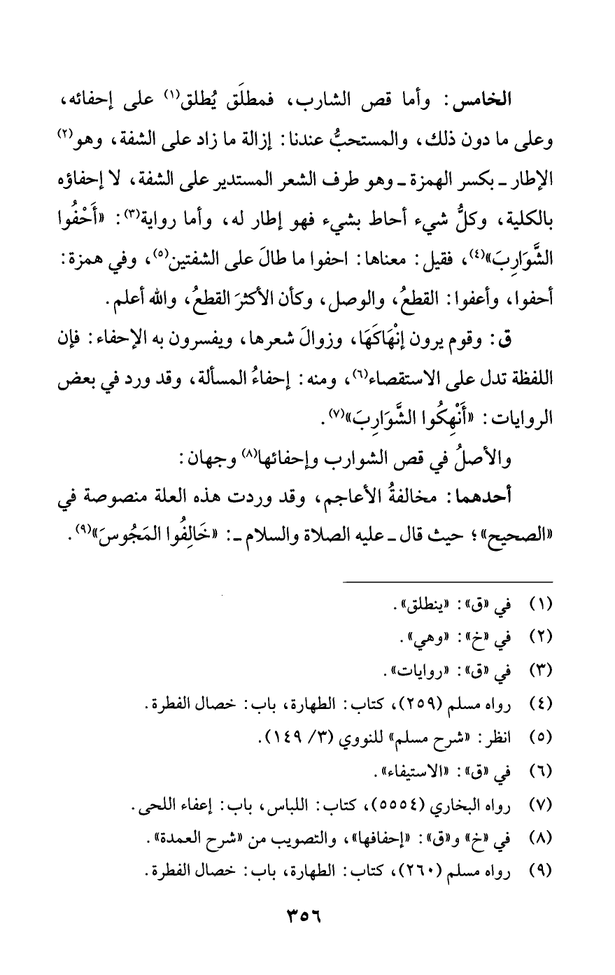 ق: وقوم يرون إنهاكها، وزوال شعرها، ويفسرون به الإحفاء: فإن اللفظة تدل على الاستقصاء (¬6)، ومنه: إحفاء المسألة، وقد ورد في بعض الروايات: «أنهكوا الشوارب» (¬7).