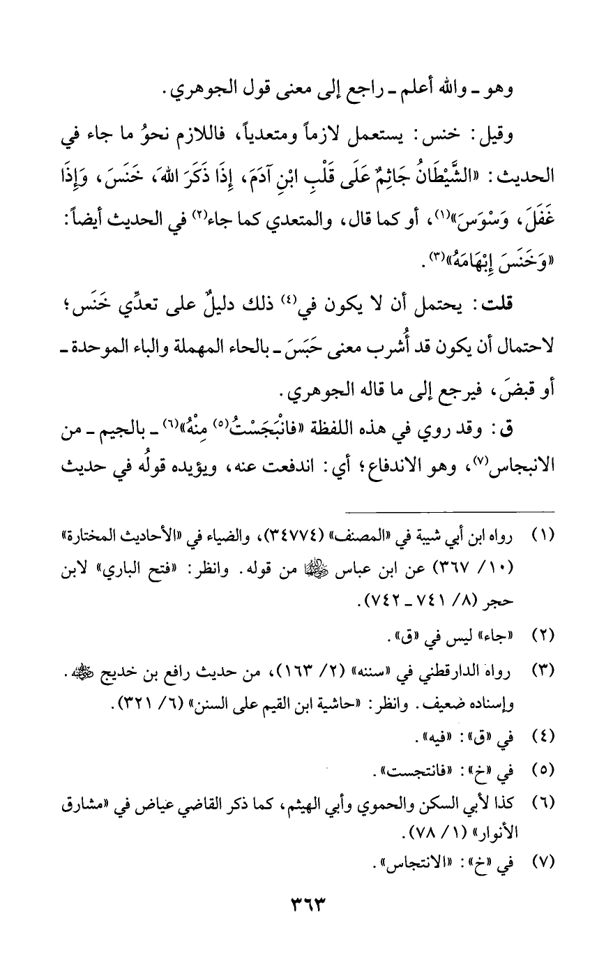 قلت: يحتمل أن لا يكون في (¬4) ذلك دليل على تعدي خنس؛ لاحتمال أن يكون قد أشرب معنى حبس - بالحاء المهملة والباء الموحدة - أو قبض، فيرجع إلى ما قاله الجوهري.