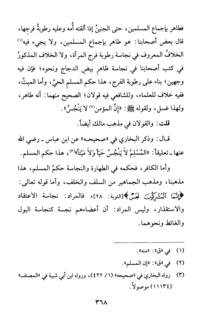 قال: وذكر البخاري في «صحيحه» عن ابن عباس -رضي الله عنها- تعليقًا: «المسلم لا ينجس حيا ولا ميتا» (¬3)، هذا حكم المسلم.