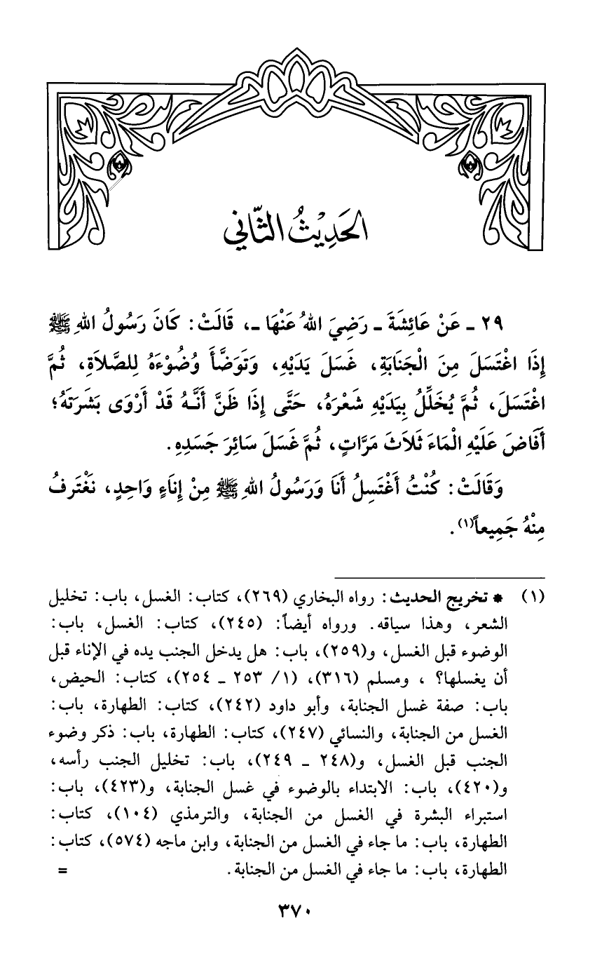 29 - عَنْ عَائِشَةَ -رضي الله عنها-، قَالَتْ: كَانَ الرسول الله - صلى الله عليه وسلم - إذَا اغْتَسَلَ مِنَ الْجَنَابَةِ، غَسَلَ يَدَيْهِ , ثُمَّ تَوَضَّأَ وُضُوءَهُ لِلصَّلاةِ , ثُمَّ اغْتَسَلَ , ثُمَّ يُخَلِّلُ بِيَدَيْهِ شَعْرَهُ , حَتَّى إذَا ظَنَّ أَنَّهُ قَدْ أَرْوَى بَشَرَتَهُ؛ أَفَاضَ عَلَيْهِ الْمَاءَ ثَلاثَ مَرَّاتٍ , ثُمَّ غَسَلَ سَائِرَ جَسَدِهِ.