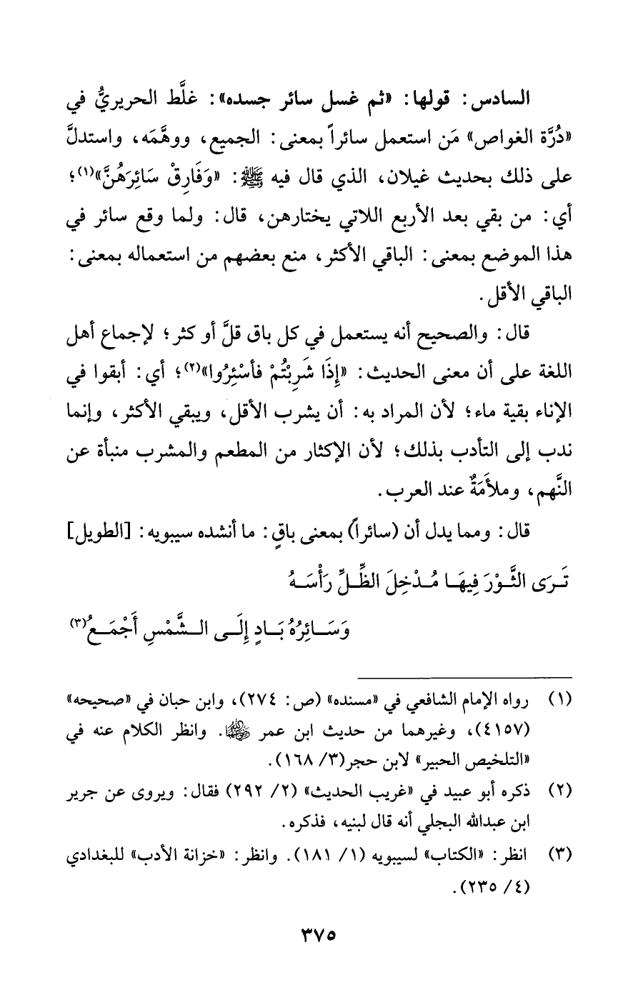 السادس: قولها: «ثم غسل سائر جسده»: غّلط الحريري في «درة الغواص» من استعمل سائرا بمعنى: الجميع، ووهمه، واستدل على ذلك بحديث غيلان، الذي قال فيه - صلى الله عليه وسلم - وفارق سائرهن (¬1)؛ أي: من بقي بعد الأربع اللاتي تختارهن، قال: ولما وقع سائر في هذا الموضع بمعنى: الباقي الأكثر، منع بعضهم من استعماله بمعنى: الباقي الأقل.