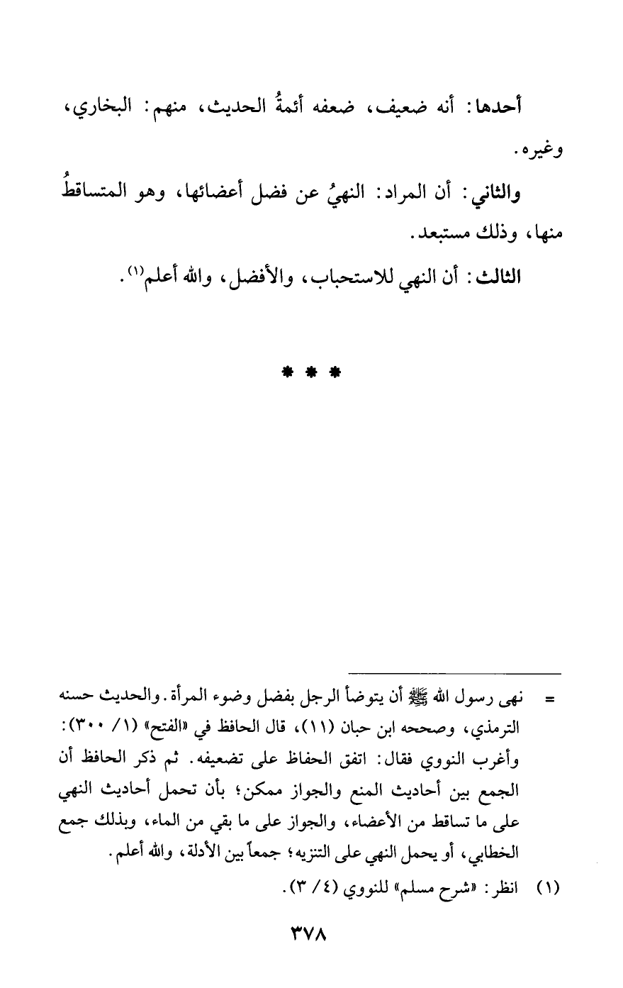 = نهى رسول الله - صلى الله عليه وسلم- أن يتوضأ الرجل بفضل وضوء المرأة. والحديث حسنه الترمذي، وصححه ابن حبان (11)، قال الحافظ في الفتح (1/ 300): وأغرب النووي فقال: اتفق الحافظ على تضعيفه. ثم ذكر الحافظ أن الجمع بين أحاديث المنع والجواز ممكن؛ بأن تحمل أحاديث النهي على ما تساقط من الأعضاء، والجواز على ما بقي من الماء، وبذلك جمع الخطابي، أو يحمل النهي على التنزيه؛ جمعاً بين الأدلة، والله أعلم.