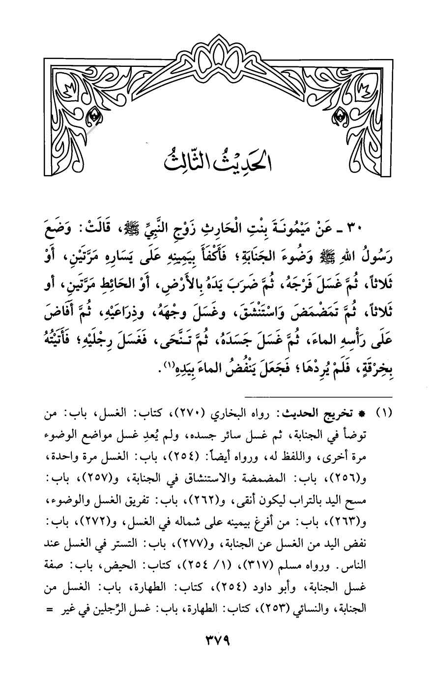 30 - عَنْ مَيْمُونَةَ بِنْتِ الْحَارِثِ زَوْجِ النَّبِيِّ - صلى الله عليه وسلم -، قَالَتْ: وَضَعَ رَسُولُ اللَّهِ - صلى الله عليه وسلم - وَضُوءَ الْجَنَابَةِ؛ فَأَكْفَأَ بِيَمِينِهِ عَلَى يَسَارِهِ مَرَّتَيْنِ، أَوْ ثَلاثاً، ثُمَّ غَسَلَ فَرْجَهُ , ثُمَّ ضَرَبَ يَدَهُ بِالأَرْضِ , أَوْ الْحَائِطِ مَرَّتَيْنِ، أَوْ ثَلاثاً، ثُمَّ تَمَضْمَضَ وَاسْتَنْشَقَ , وَغَسَلَ وَجْهَهُ، وَذِرَاعَيْهِ, ثُمَّ أَفَاضَ عَلَى رَأْسِهِ الْمَاءَ , ثُمَّ غَسَلَ جَسَدَهُ , ثُمَّ تَنَحَّى , فَغَسَلَ رِجْلَيْهِ , فَأَتَيْتُهُ بِخِرْقَةٍ فَلَمْ يُرِدْهَا؛ فَجَعَلَ يَنْفُضُ الْمَاءَ بِيَدِهِ (¬1).