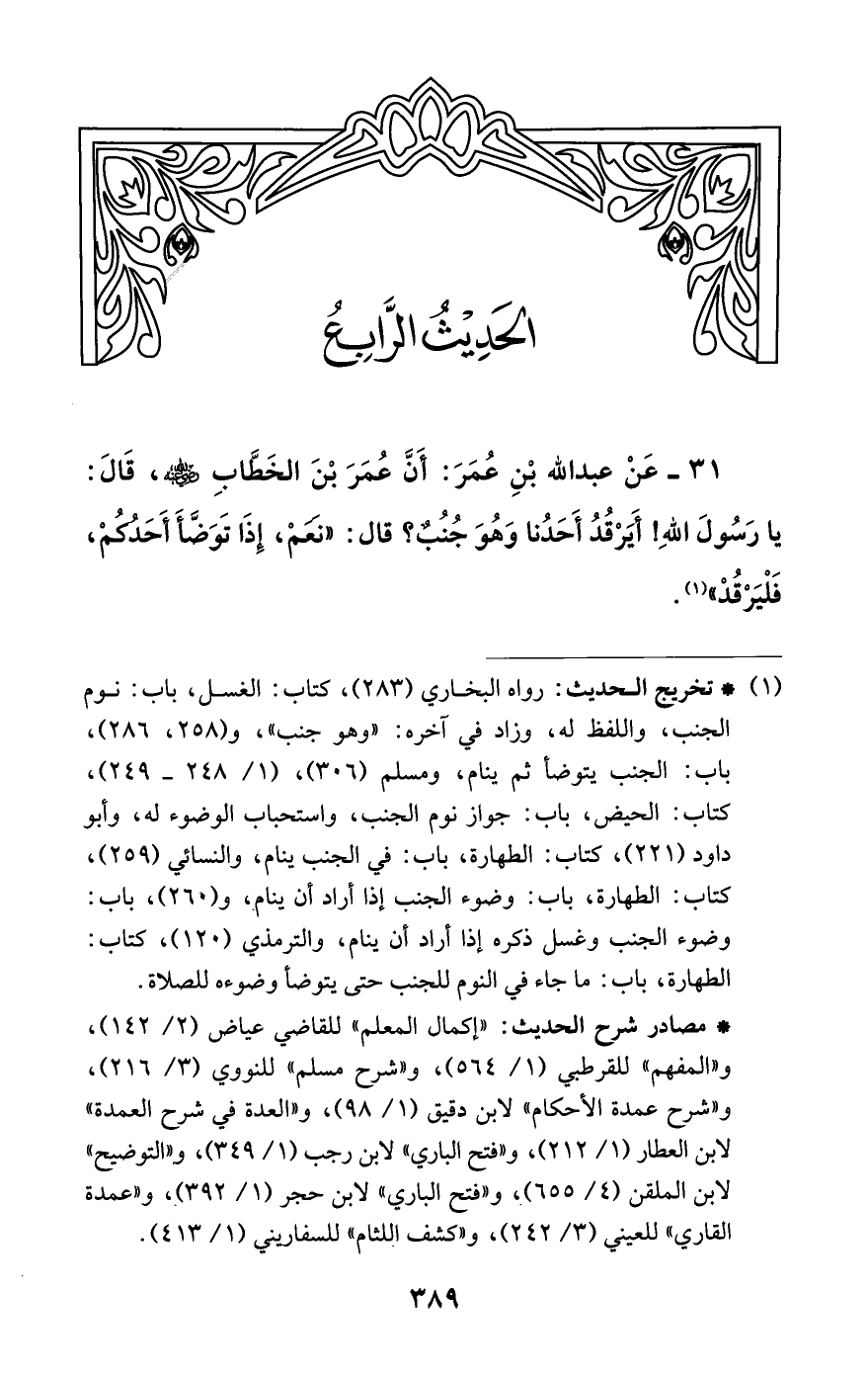 31 - عَنْ عَبْدِ اللَّهِ بْنِ عُمَرَ: أَنَّ عُمَرَ بْنَ الْخَطَّابِ - رضي الله عنه -، قَالَ: يَا رَسُولَ اللَّهِ! أَيَرْقُدُ أَحَدُنَا وَهُوَ جُنُبٌ؟ قَالَ: «نَعَمْ , إذَا تَوَضَّأَ أَحَدُكُمْ، فَلْيَرْقُدْ» (¬1).