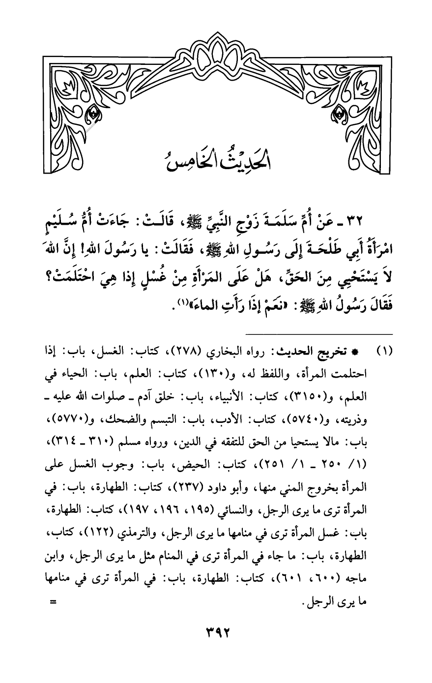 32 - عَنْ أُمِّ سَلَمَة زَوْجِ النَّبِيِّ - صلى الله عليه وسلم -، قَالَتْ: جَاءَتْ أُمُّ سُلَيْمٍ امْرَأَةُ أَبِي طَلْحَةَ إلَى رَسُولِ اللَّهِ - صلى الله عليه وسلم-، فَقَالَتْ: يَا رَسُولَ اللَّهِ! إنَّ اللَّهَ لا يَسْتَحْيِي مِنْ الْحَقِّ , هَلْ عَلَى الْمَرْأَةِ مِنْ غُسْلٍ إذَا هِيَ احْتَلَمَتْ؟ فَقَالَ رَسُولُ اللَّهِ - صلى الله عليه وسلم -: «نَعَمْ إذَا رَأَتِ الْمَاءَ» (¬1).