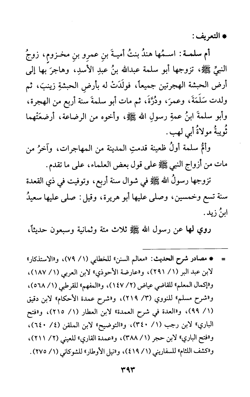 أم سلمة: اسمها هند بنت أمية بن عمرو بن مخزوم، زوج النبي - صلى الله عليه وسلم -، تزوجها أبو سلمة عبد الله بن عبد الأسد، وهاجر بها إلى أرض الحبشة الهجرتين جميعا، فولدت له بأرض الحبشة زينب، ثم ولدت سلمة، وعمر، ودرة، ثم مات أبو سلمة سنة أربع من الهجرة، وأبو سلمة ابن عمة رسول الله - صلى الله عليه وسلم -، وأخوه من الرضاعة، أرضعتهما ثويبة مولاة أبي لهب.