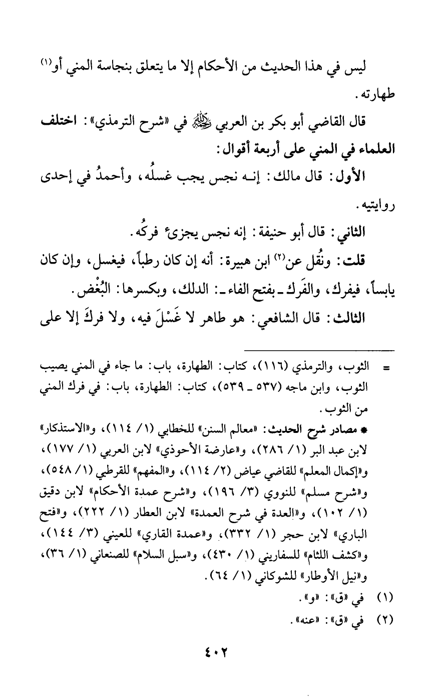 قال القاضي أبو بكر بن العربي -رحمه الله- في شرح الترمذي: اختلف العلماء في المني على أربعة أقوال: