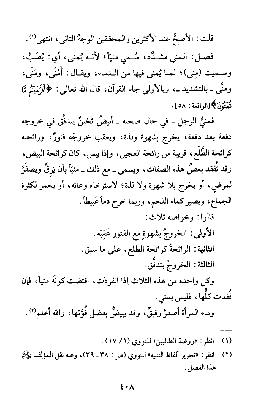 فمنيُّ الرجل -في حال صحته- أبيض ثخينٌ يتدفق في خروجه دفعةً بعد دفعة، يخرج بشهوة ولذة، ويعقب خروجه فتورٌ، ورائحته كرائحة الطَّلْع، قريبة من رائحة العجين، وإذا يبس، كان كرائحة البيض، وقد تفقد بعض هذه الصفات، ويسمى -مع ذلك- منيا بأن يرق ويصفر لمرض، أو يخرج بلا شهوة ولا لذة؛ لاسترخاء وعائة، أو يحمر لكثرة الجماع، ويصير كماء اللحم، وربما خرج دما عبيطًا.