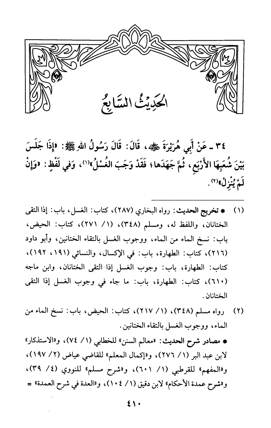 34 - عَنْ أَبِي هُرَيْرَةَ - رضي الله عنه-، قال: قال رسول الله - صلى الله عليه وسلم-: «إذَا جَلَسَ بَيْنَ شُعَبِهَا الأَرْبَعِ , ثُمَّ جَهَدَهَا؛ فَقَدْ وَجَبَ الْغُسْلُ» (¬1) , وَفِي لَفْظٍ: «وَإِنْ لَمْ يُنْزِلْ» (¬2).