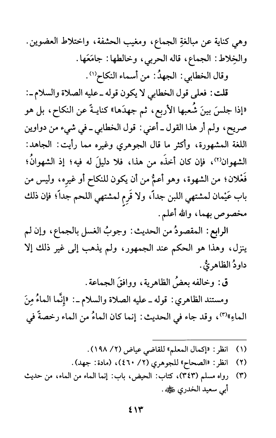 قلت: فعلى قول الخطابي لا يكون قوله -عليه الصلاة والسلام-: «إذا جَلسَ بينَ شُعبها الأربع، ثم جهدَها» كنايةً عن النكاح، بل هو صريح، ولم أر هذا القول -أعني: قول الخطابي - في شيء من دواوين اللغة المشهورة، وأكثر ما قال الجوهري وغيره مما رأيت: الجاهد: الشهوان (¬2)، فإن كان أخذَه من هذا، فلا دليلَ له فيه؛ إذ الشهوان فَعْلان؛ من الشهوة، وهو أعمُّ من أن يكون للنكاح أو غيره، وليس من باب عَيْمان لمشتهي اللبن جداً، ولا قَرِمٍ لمشتهي اللحم جداً، فإن ذلك مخصوص بهما، والله أعلم.