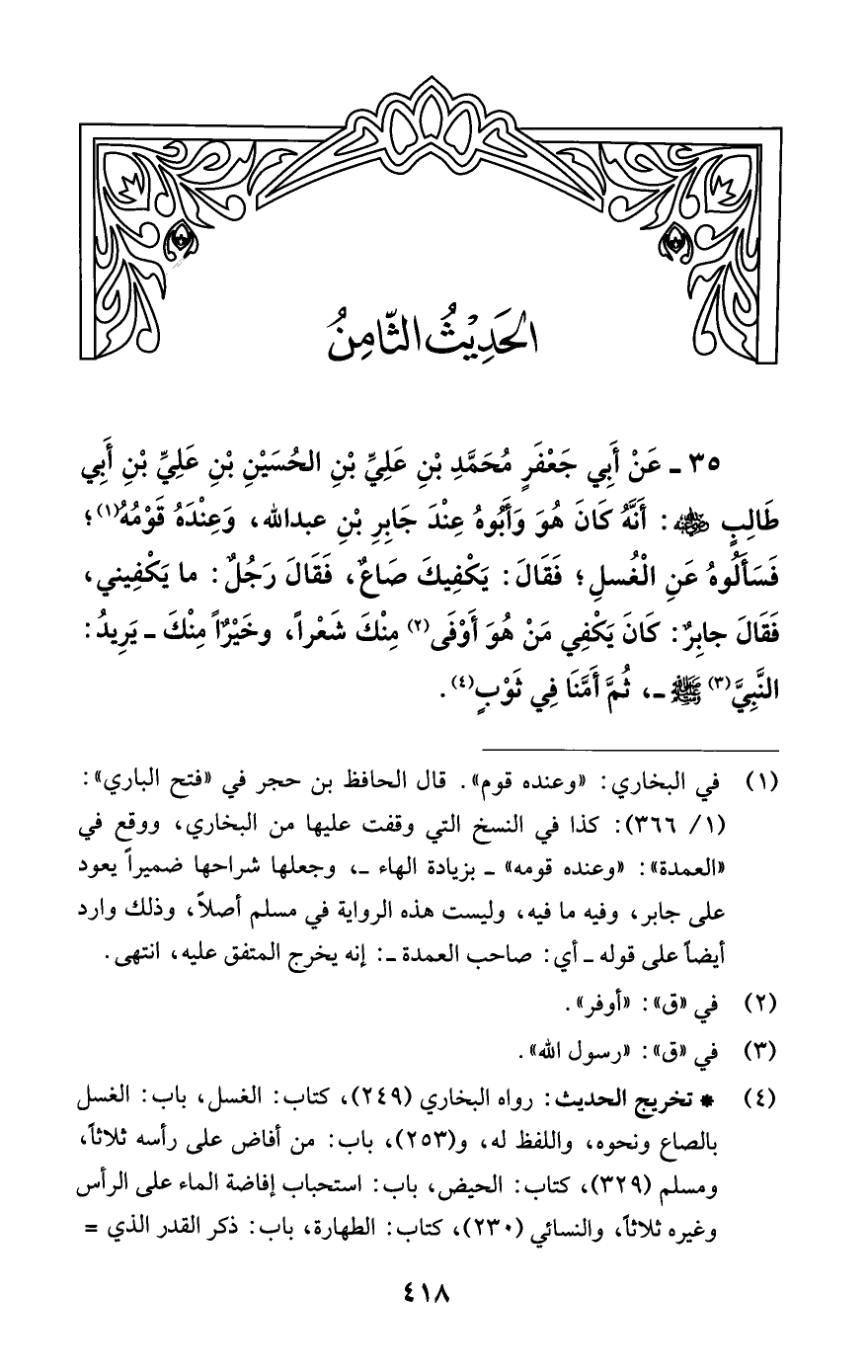 35 - عَنْ أَبِي جَعْفَرٍ مُحَمَّدِ بْنِ عَلِيِّ بْنِ الْحُسَيْنِ بْنِ عَلِيِّ بْنِ أَبِي طَالِبٍ -رضي اللهُ عنهم-: أَنَّهُ كَانَ هُوَ وَأَبُوهُ عِنْدَ جَابِرِ بْنِ عَبْدِ اللَّهِ , وَعِنْدَهُ قَوْمُهُ (¬1)؛ فَسَأَلُوهُ عَنْ الْغُسْلِ؛ فَقَالَ: يَكْفِيكَ صَاعٌ، فَقَالَ رَجُلٌ: مَا يَكْفِينِي , فَقَالَ جَابِرٌ: كَانَ يَكْفِي مَنْ هُوَ أَوْفَى (¬2) مِنْك شَعَرَاً , وَخَيْراً مِنْكَ - يُرِيدُ: النَّبِيَّ (¬3) - صلى الله عليه وسلم -، ثُمَّ أَمَّنَا فِي ثَوْبٍ (¬4).