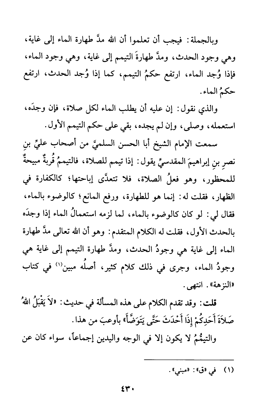 وبالجملة: فيجب أن تعلموا أن الله مدَّ طهارة الماء إلى غاية، وهي وجود الحدث، ومد طهارة التيمم إلى غاية، وهي وجود الماء، فإذا وجد الماء، ارتفع حكم التيمم، كما إذا وجد الحدث ارتفع حكم الماء.
