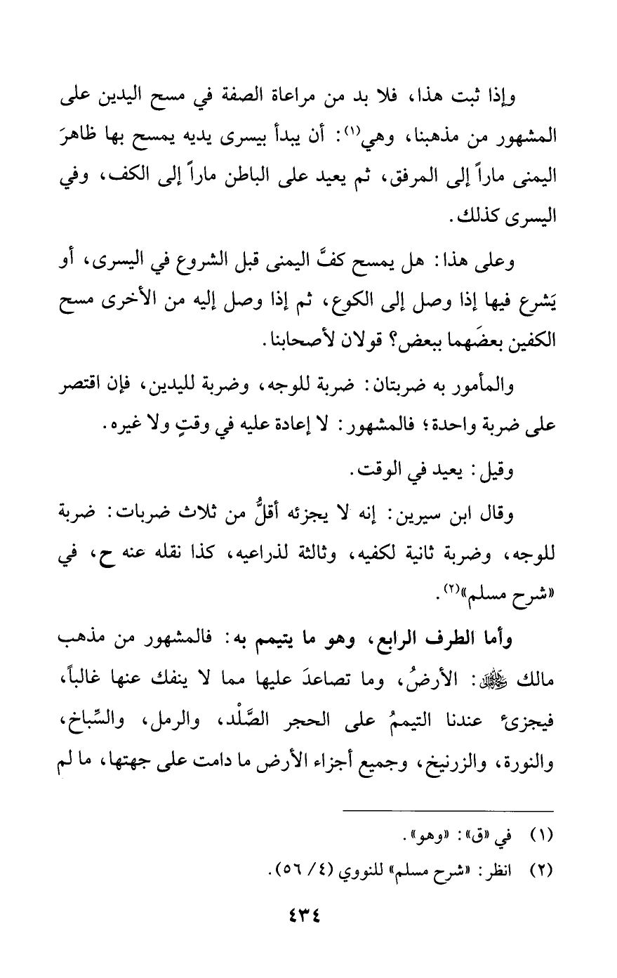 وإذا ثبت هذا، فلا بد من مراعاة الصفة في مسح اليدين على المشهور من مذهبنا، وهي (¬1): أن يبدأ بيسرى يديه يمسح بها ظاهر اليمنى، مارا إلى المرفق، ثم يعيد على الباطن مارا إلى الكف، وفي اليسرى كذلك.