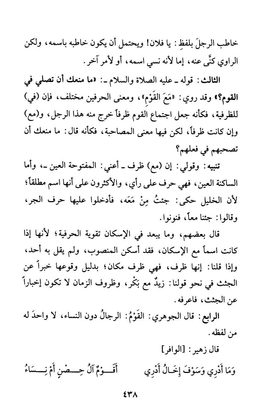 الثالث: قوله -عليه الصلاة والسلام-: «ما منعك أن تصلي في القوم؟» وقد روي: «مَعَ القَوْمِ»، ومعنى الحرفين مختلف، فإن (في) للظرفية، فكأنه جعل اجتماع القوم ظرفاً خرج منه هذا الرجل، و (مع) وإن كانت ظرفًا، لكن فيها معنى المصاحبة، فكأنه قال: ما منعك أن تصحبهم في فعلهم؟
