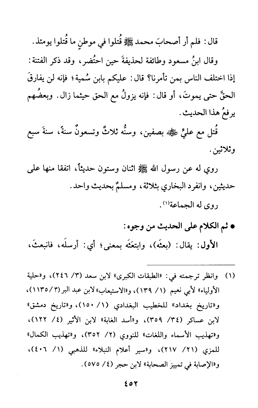 (¬1) وانظر ترجمته في: (الاطبقات الكبرى» لابن سعد (3/ 246)، و «حلية الأولياء» لأبي نعيم (1/ 139)، و «الاستيعاب» لابن عبد البر (3/ 1135)، و «تاريخ بغداد» للخطيب البغدادي (1/ 150)، و «تاريخ دمشق» لابن عساكر (34/ 359)، و «أسد الغابة» لابن الأثير (4/ 122)، و «تهذيب الأسماء واللغات» للنووي (2/ 352)، و «تهذيب الكمال» للمزي (21/ 217)، و «سير أعلام النبلاء» للذهبي (1/ 406)، و «الإصابة في تمييز الصحابة» لابن حجر (4/ 575).