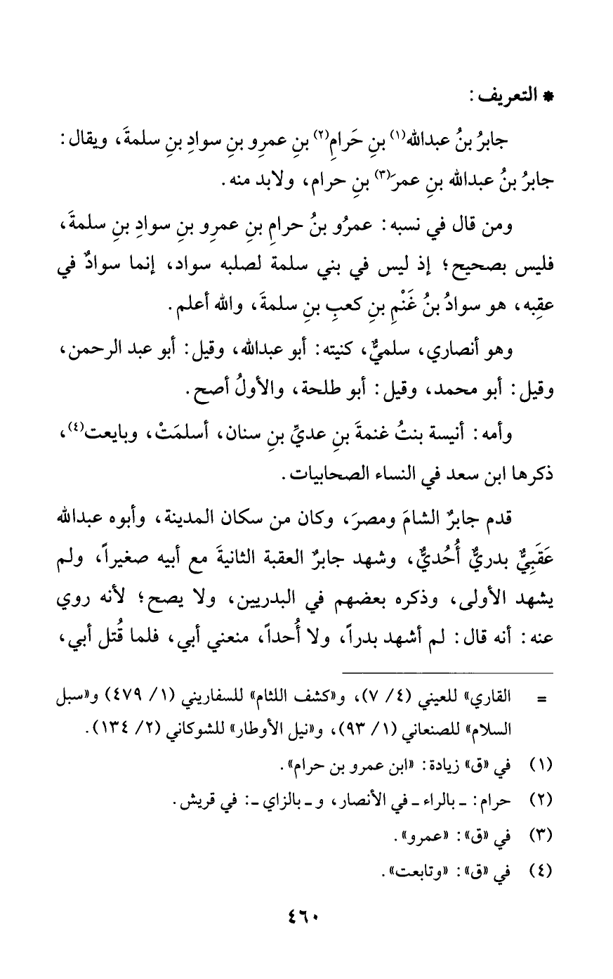 جابر بن عبد الله (¬1) بن حرام (¬2) بن عمرو بن سواد بن سلمة، ويقال: جابر بن عبد الله بن عمر (¬3) بن حرام، ولا بد منه.