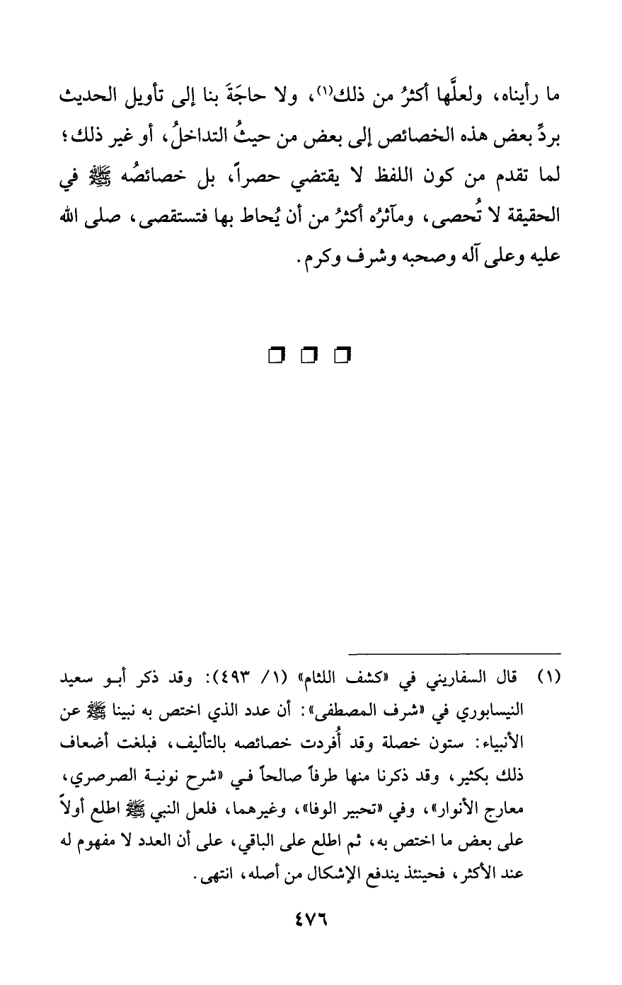 ما رأيناه، ولعلها أكثر من ذلك (¬1)، ولا حاجة بنا إلى تأويل الحديث برد بعض هذه الخصائص إلى بعض من حيث التداخل، أو غير ذلك؛ لما تقدم من كون اللفظ لا يقتضي حصرا، بل خصائصه - صلى الله عليه وسلم - في الحقيقة - لا تحصى، ومآثره أكثر من أن يحاط بها فتستقصى، صلى الله عليه وعلى آله وصحبه وشرف وكرم.
