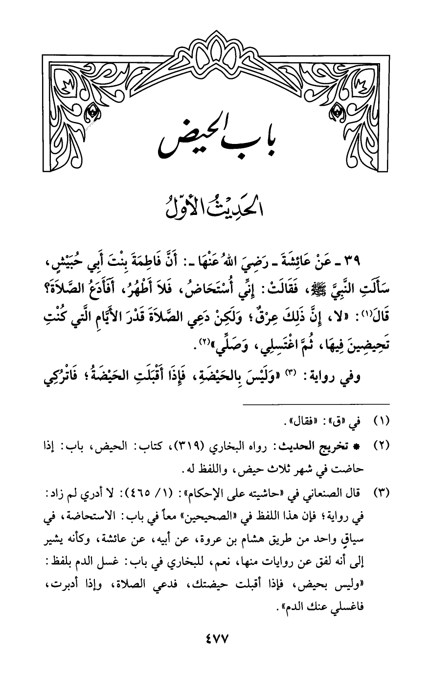 39 - عَنْ عَائِشَةَ- رضي الله عنها-: أَنَّ فَاطِمَةَ بِنْتَ أَبِي حُبَيْشٍ، سَأَلَتِ النَّبِيَّ - صلى الله عليه وسلم -، فَقَالَتْ: إنِّي أُسْتَحَاضُ، فَلا أَطْهُرُ, أَفَأَدَعُ الصَّلاةَ؟ قَالَ (¬1): «لا، إنَّ ذَلِكَ عِرْقٌ؛ وَلَكِنْ دَعِي الصَّلاةَ قَدْرَ الأَيَّامِ الَّتِي كُنْتِ تَحِيضِينَ فِيهَا, ثُمَّ اغْتَسِلِي، وَصَلِّي» (¬2).