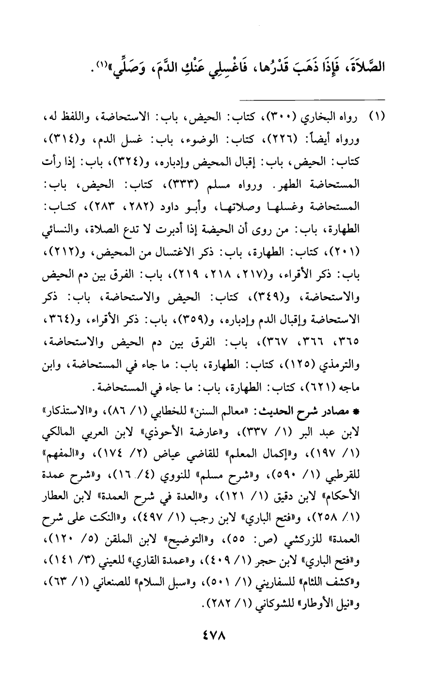 (¬1) رواه البخاري (300)، كتاب: الحيض، باب: الاستحاضة، واللفظ له، ورواه أيضا: (226)، كتاب: الوضوء، باب: غسل الدم، و (314)، كتاب: الحيض، باب: إقبال المحيض وإدباره، و (324)، باب: إذا رأت المستحاضة الطهر. ورواه مسلم (333)، كتاب: الحيض، باب: المستحاضة وغسلها وصلاتها، وأبو داود (282، 283)، كتاب: الطهارة، باب: من روى أن الحيضة إذا أدبرت لا تدع الصلاة، والنسائي (201)، كتاب: الطهارة، باب: ذكر الاغتسال من المحيض، و (212)، باب: ذكر الأقراء، و (217، 218، 219)، باب: الفرق بين دم الحيض والاستحاضة، و (349)، كتاب: الحيض والاستحاضة، باب: ذكر الاستحاضة وإقبال الدم وإدباره، و (359)، باب: ذكر الأقراء، و (364، 365، 366، 367)، باب: الفرق بين دم الحيض والاستحاضة، والترمذي (125)، كتاب: الطهارة، باب: ما جاء في المستحاضة، وابن ماجه (621)، كتاب: الطهارة، باب: ما جاء في المستحاضة.
