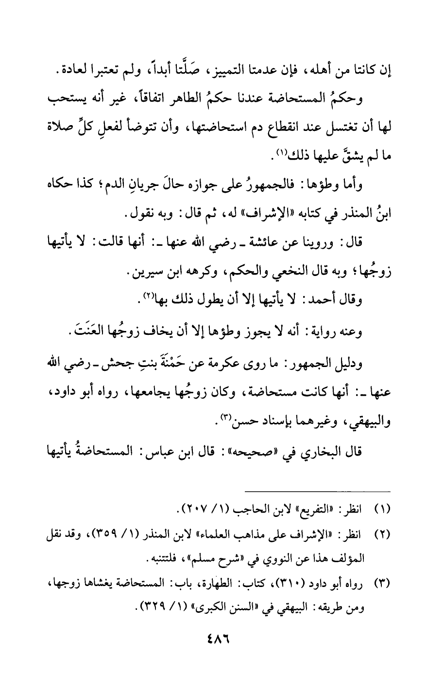 ودليل الجمهور: ما روى عكرمة عن حَمْنَةَ بنتِ جحش -رضي الله عنها-: أنها كانت مستحاضة، وكان زوجُها يجامعها، رواه أبو داود، والبيهقي، وغيرهما بإسناد حسن (¬3).