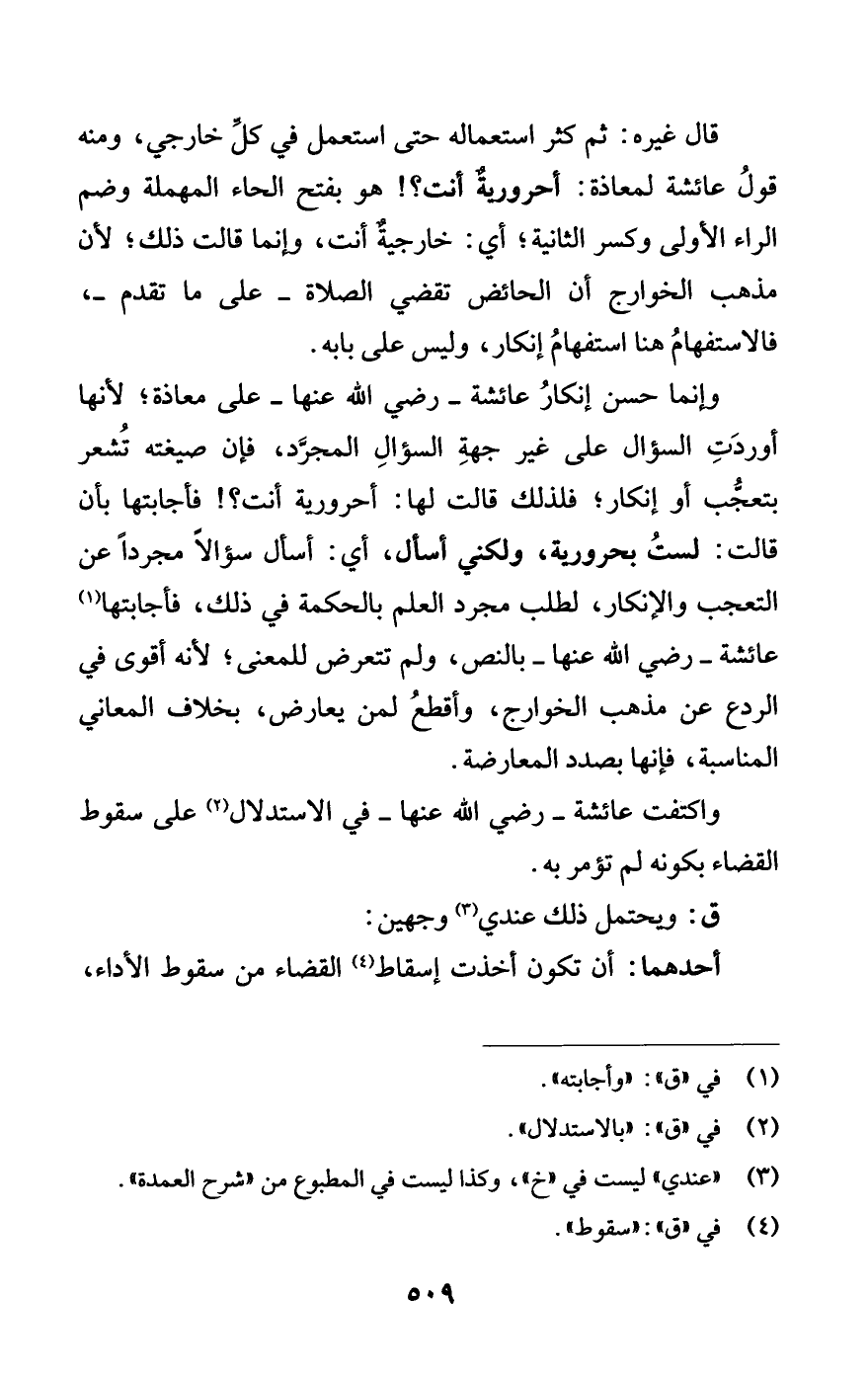 قال غيره: ثم كثر استعماله حتى استعمل في كل خارجي، ومنه قول عائشة لمعاذة: أحروريةٌ أنت؟! هو بفتح الحاء المهملة وضم الراء الأولى وكسر الثانية؛ أي: خارجية أنت، وإنما قالت ذلك؛ لأن مذهب الخوارج أن الحائض تقضي الصلاة -على ما تقدم-، فالاستفهام هنا استفهام إنكار، وليس على بابه.