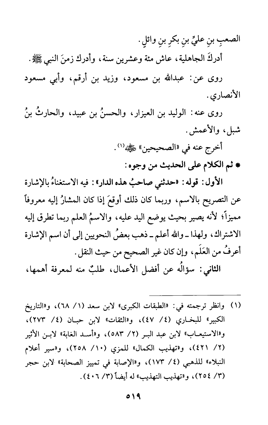 (¬1) وانظر ترجمته في: الطبقات الكبرى لابن سعد (1/ 68)، والتاريخ الكبير للبخاري (4/ 47)، والثقات لابن حبان (4/ 273)، والاستيعاب لابن عبد البر (2/ 583)، وأسد الغابة لابن الأثير (2/ 421)، وتهذيب الكمال للمزي (10/ 258)، وسير أعلام النبلاء للذهبي (4/ 173)، والإصابة في تمييز الصحابة لابن حجر (3/ 254)، وتهذيب التهذيب له أيضا (3/ 406).