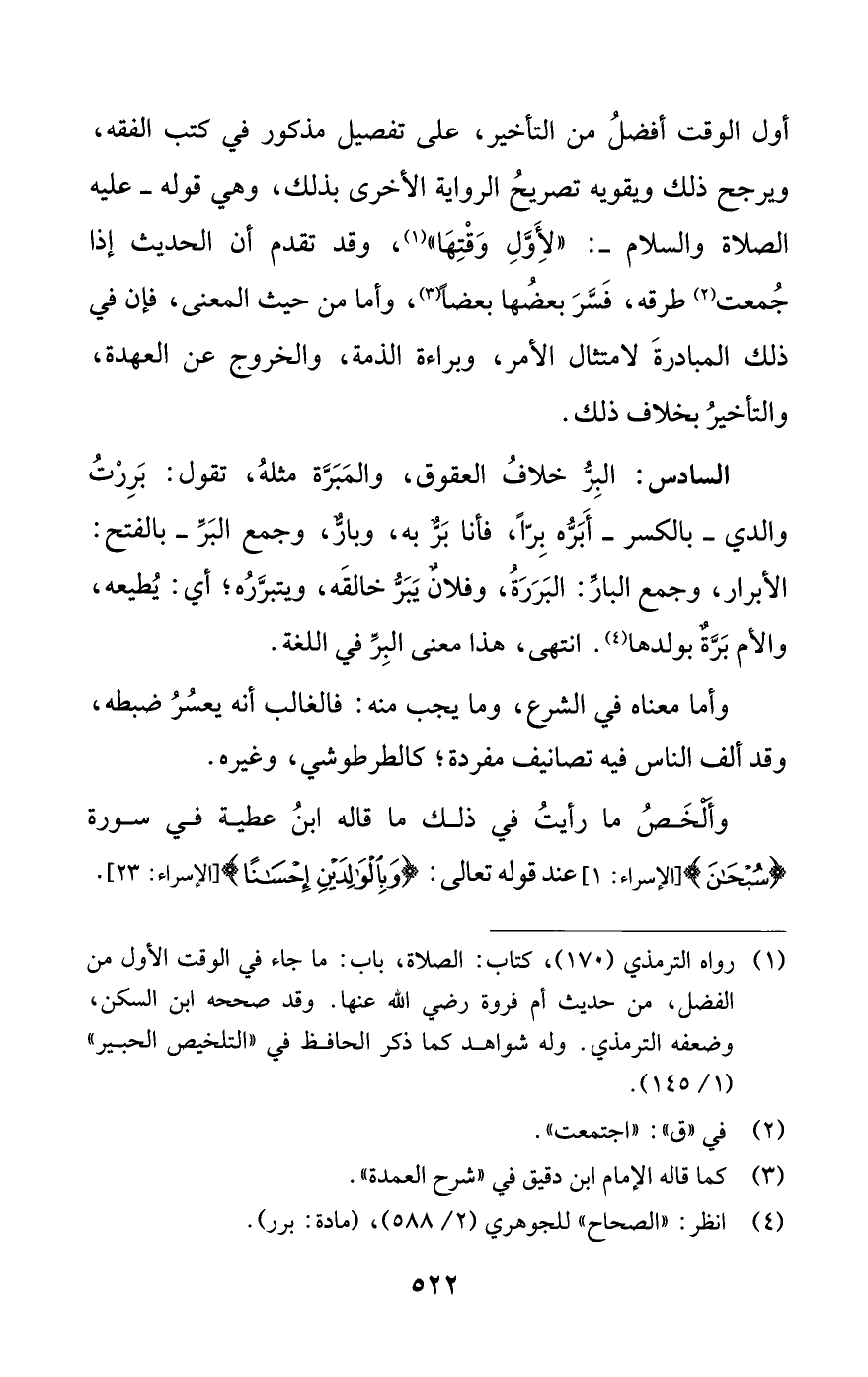 (¬1) رواه الترمذي (170)، كتاب: الصلاة، باب: ما جاء في الوقت الأول من الفضل، من حديث أم فروة - رضي الله عنها-. وقد صححه ابن السكن، وضعفه الترمذي. وله شواهد كما ذكر الحافظ في التلخيص الحبير (1/ 145).