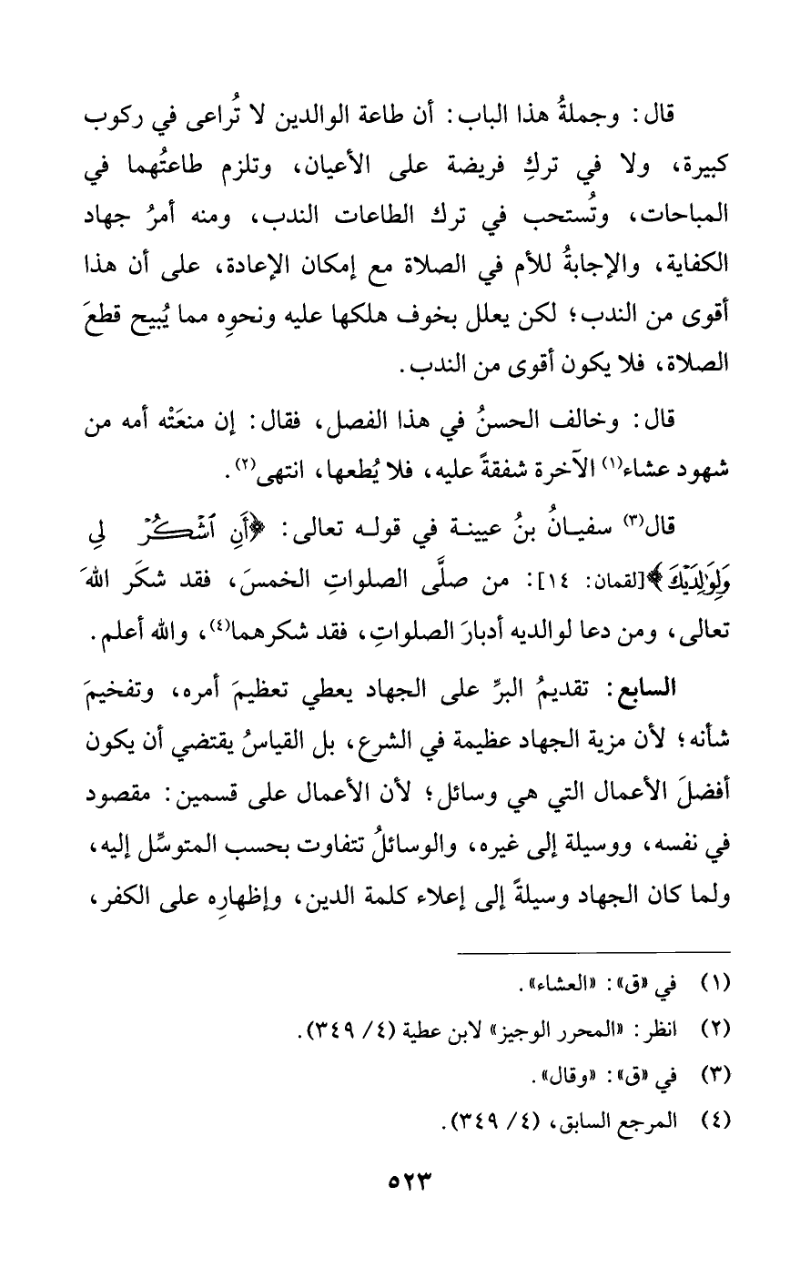 قال: وجملة هذا الباب: أن طاعة الوالدين لا تراعى في ركوب كبيرة، ولا في ترك فريضة على الأعيان، وتلزم طاعتهما في المباحات، وتستحب في ترك الطاعات الندب، ومنه أمر جهاد الكفاية، والإجابة للأم في الصلاة مع إمكان الإعادة، على أن هذا أقوى من الندب؛ لكن يعلل بخوف هلكها عليه ونحوه مما يبيح قطع الصلاة، فلا يكون أقوى من الندب.