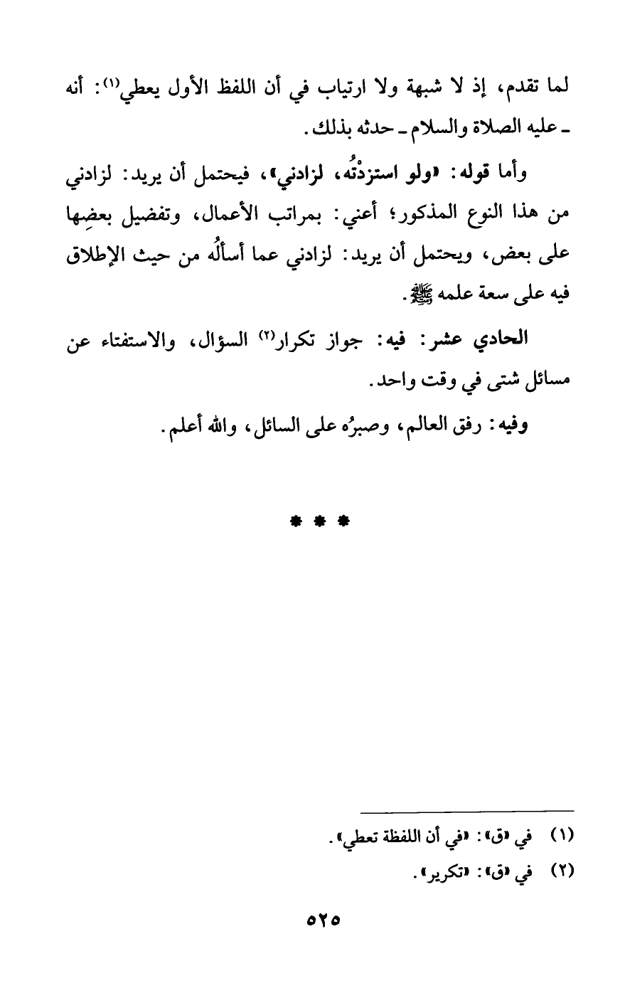 وأما قوله: «ولو استزدْتُه، لزادني»، فيحتمل أن يريد: لزادني من هذا النوع المذكور؛ أعني: بمراتب الأعمال، وتفضيل بعضها على بعض، ويحتمل أن يريد: لزادني عما أسأله من حيث الإطلاق فيه على سعة علمه - صلى الله عليه وسلم -.