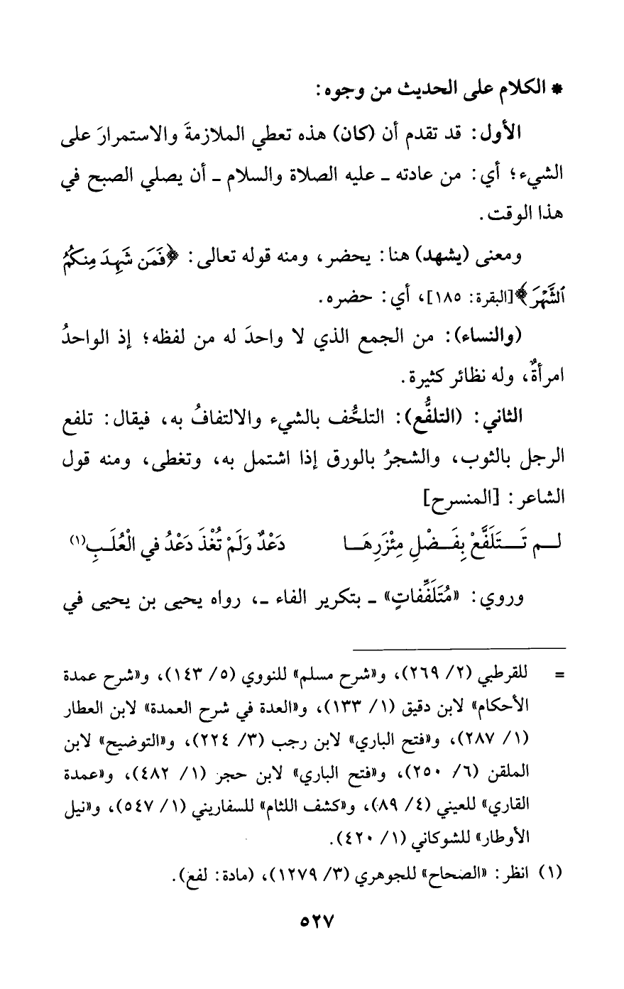 = للقرطبي (2/ 269)، و «شرح مسلم9) للنووي (5/ 143)، و «شرح عمدة الأحكام» لبا ندقيق (1/ 133)، و «العدة في شرح العمدة» لابن العطار (1/ 287)، و «فتح الباري» لابن رجب (3/ 224)، و «التوضيح» لابن الملقن (6/ 250)، و «فتح الباري» لابن حجر (1/ 482)، و «عمدة القاري» للعيني (4/ 89)، و «كشف اللثام» للسفاريني (1/ 547)، و «نيل الأوطار» للشوكاني (1/ 420).