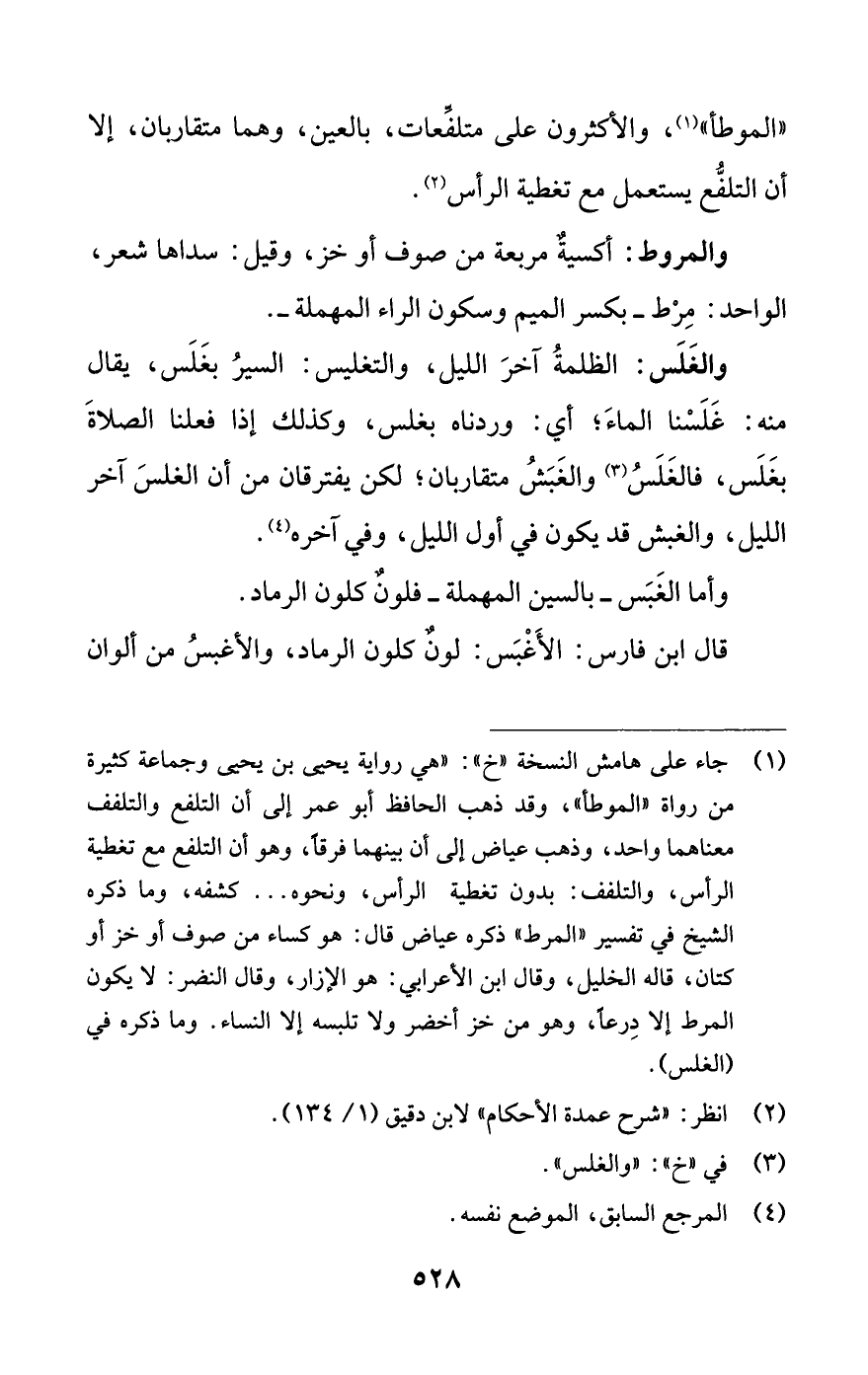 (¬1) جاء على هامش النسخة (خ): «هي رواية يحيى بن يحيى وجماعة كثيرة من راوة «الموطأ»، وقد ذهب الحافظ أبو عمر إلى أن التلفع والتلفف معناهما واحد، وذهب عياض إلى أن بينهما فرقا، وهو أن التلفع مع تغطية الرأس، والتلفف: بدون تغطية الرأس، ونحوه .... كشفه، وما ذكره الشيخ في تفسير «المرط» ذكره عياض قال: هو كساء من صوف أو خز أو كتان، قال الخليل، وقال ابن الأعرابي: هو الإزار، وقال النضر: لا يكون المرط إلا درعا، وهو من خز أخضر ولا تلبس إلا النساء. وما ذكره في (الغلس).