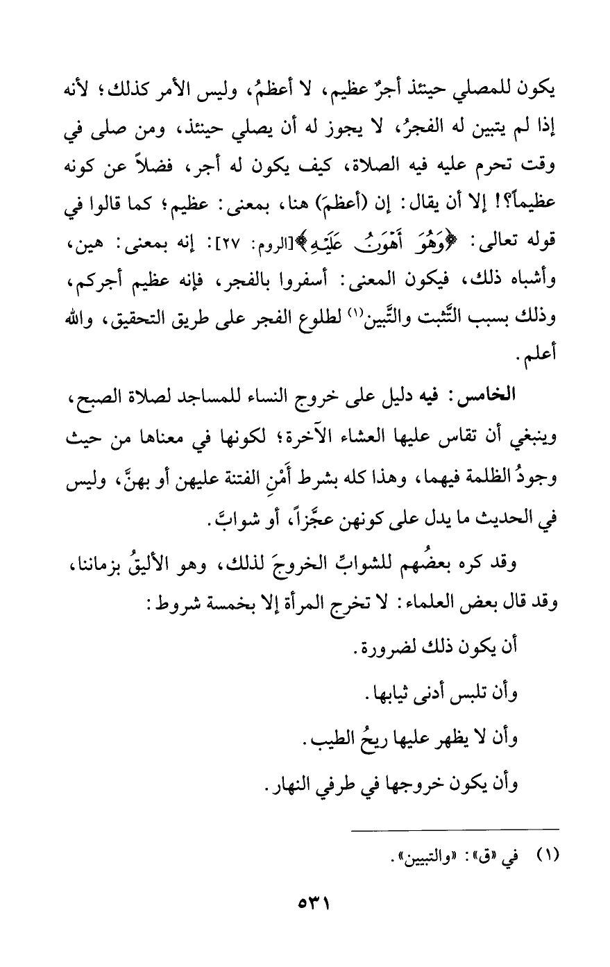 يكون للمصلي حينئذ أجر عظيم، لا أعظم، وليس الأمر كذلك؛ لأنه إذا لم يتبين له الفجر، لا يجوز له أن يصلي حينئذ، ومن صلى في وقت تحرم عليه فيه الصلاة، كيف يكون له أجر، فضلاً عن كونه عظيما؟! إلا أن يقال: إن (أعظم) هنا، بمعنى: عظيم؛ كما قالوا في قوله تعالى: {وَهُوَ أَهْوَنُ عَلَيْهِ} [الروم: 27]: إنه بمعنى: هين، وأشباه ذلك، فيكون المعنى: أسفروا بالفجر، فإنه عظيم أجركم، وذلك بسبب التثبت والتبين (¬1) لطلوع الفجر على طريق التحقيق، والله أعلم.