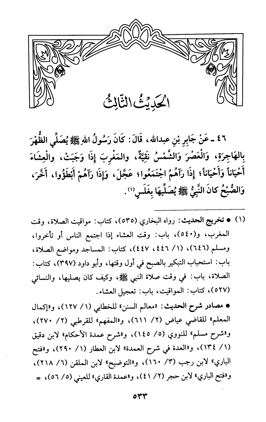 46 - عَنْ جَابِرِ بْنِ عَبْدِ اللَّهِ، قَالَ: كَانَ رَسُولُ اللَّهِ - صلى الله عليه وسلم - يُصَلِّي الظُّهْرَ بِالْهَاجِرَةِ , وَالْعَصْرَ وَالشَّمْسُ نَقِيَّةٌ وَالْمَغْرِبَ إذَا وَجَبَتْ , وَالْعِشَاءَ أَحْيَاناً وَأَحْيَاناً؛ إذَا رَآهُمْ اجْتَمَعُوا؛ عَجَّلَ، وَإِذَا رَآهُمْ أَبْطَئُوا؛ أَخَّرَ , وَالصُّبْحُ كَانَ النَّبِيُّ - صلى الله عليه وسلم - يُصَلِّيهَا بِغَلَسٍ (¬1).