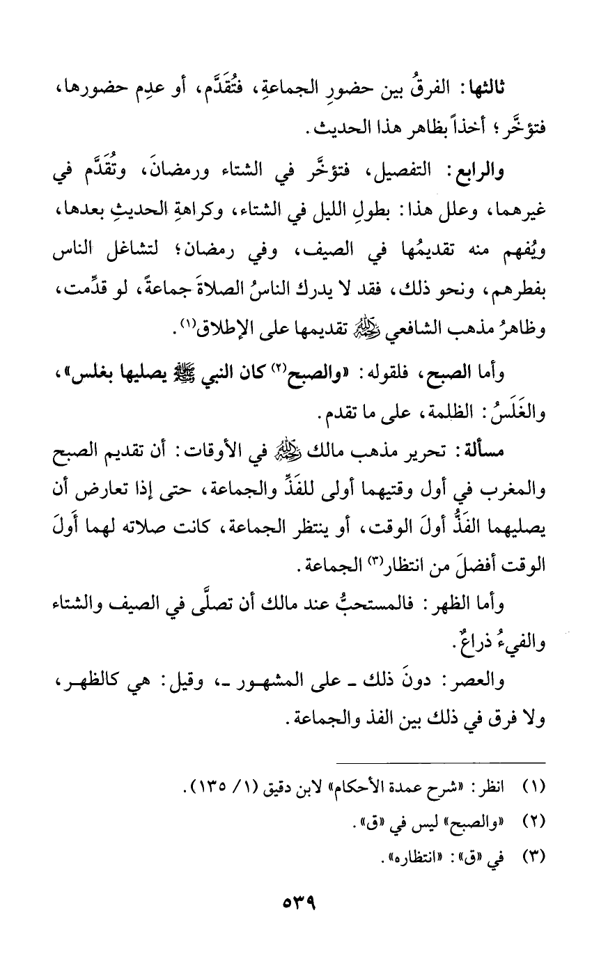 تحرير مذهب مالك رحمه الله في الأوقات: أن تقديم الصبح والمغرب في أول وقتهما أولى للفذ والجماعة، حتى إذا تعارض أن يصليهما الفذ أول الوقت، أو ينتظر الجماعة، كانت صلاته لهما أول الوقت أفضل من انتظار (¬3) الجماعة.