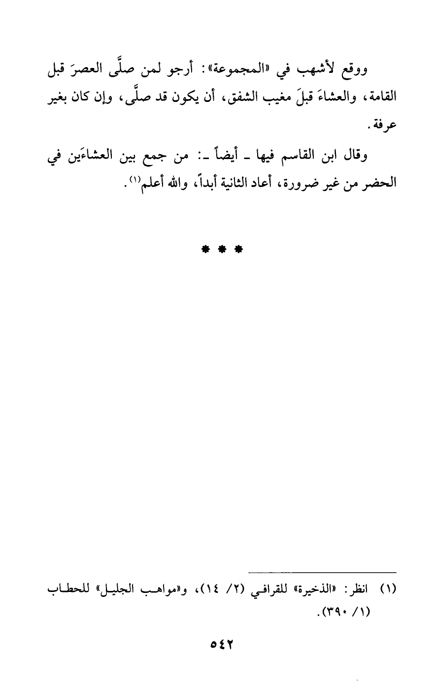 ووقع لأشهب في «المجموعة»: أرجو لمن صلى العصر قبل القامة، والعشاء قبل مغيب الشفق، أن يكون قد صلى، وإن كان بغير عرفة.