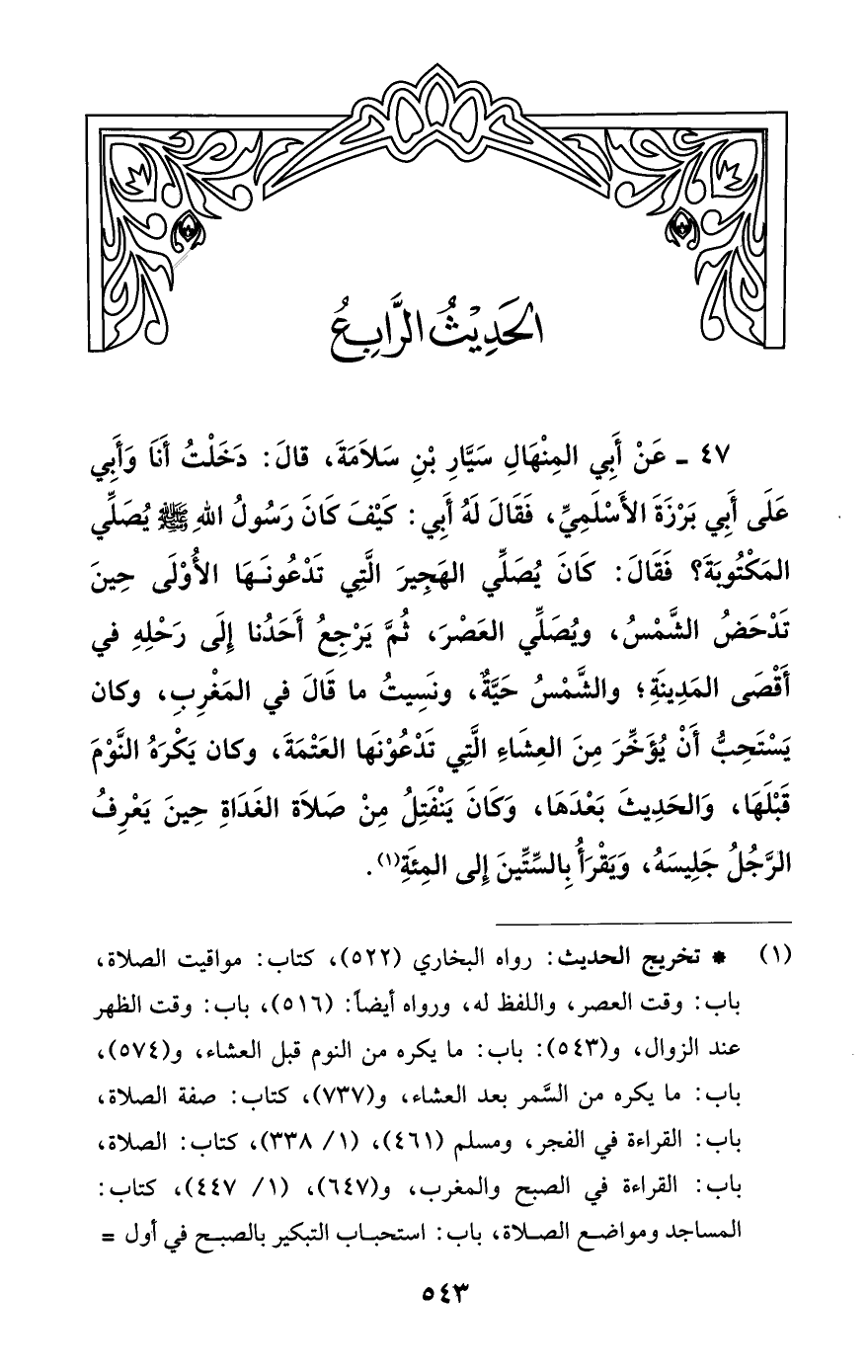 47 - عَنْ أَبِي الْمِنْهَالِ سَيَّارِ بْنِ سَلامَةَ، قَالَ: دَخَلْتُ أَنَا وَأَبِي عَلَى أَبِي بَرْزَةَ الأَسْلَمِيِّ , فَقَالَ لَهُ أَبِي: كَيْفَ كَانَ رَسُولُ اللَّهِ - صلى الله عليه وسلم - يُصَلِّي الْمَكْتُوبَةَ؟ فَقَالَ: كَانَ يُصَلِّي الْهَجِيرَ الَّتِي تَدْعُونَهَا الأُولَى حِينَ تَدْحَضُ الشَّمْسُ , وَيُصَلِّي الْعَصْرَ , ثُمَّ يَرْجِعُ أَحَدُنَا إلَى رَحْلِهِ فِي أَقْصَى الْمَدِينَةِ؛ وَالشَّمْسُ حَيَّةٌ، وَنَسِيتُ مَا قَالَ فِي الْمَغْرِبِ، وَكَانَ يُسْتَحَبُّ أَنْ يُؤَخِّرَ مِنْ الْعِشَاءِ الَّتِي تَدْعُونَهَا الْعَتَمَةَ، وَكَانَ يَكْرَهُ النَّوْمَ قَبْلَهَا , وَالْحَدِيثُ بَعْدَهَا، وَكَانَ يَنْفَتِلُ مِنْ صَلاةِ الْغَدَاةِ حِينَ يَعْرِفُ الرَّجُلَ جَلِيسَهُ، وَكَانَ يَقْرَأُ بِالسِّتِّينَ إلَى الْمِئَةِ (¬1).