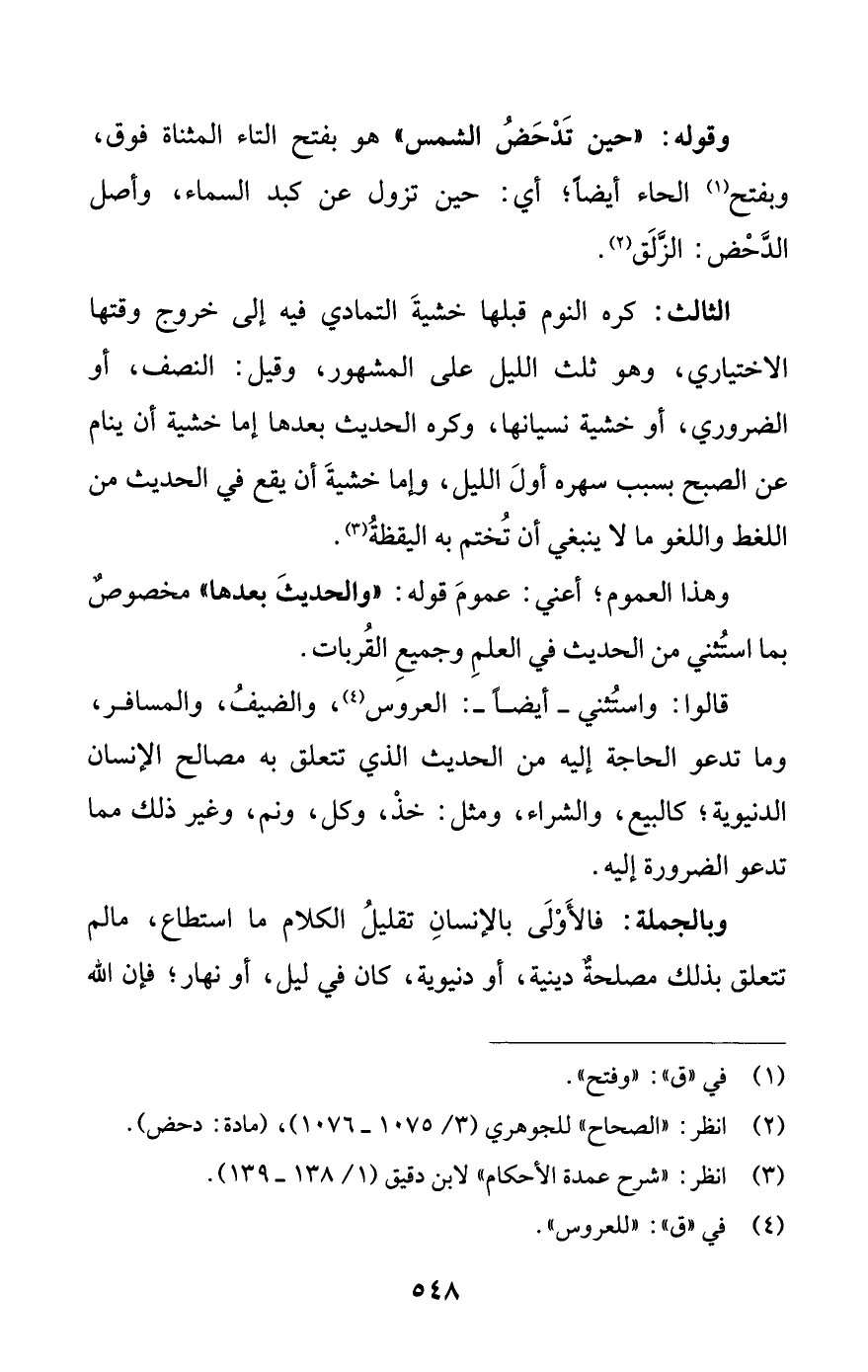 وبالجملة: فالأَوْلَى بالإنسانِ تقليلُ الكلام ما استطاع، ما لم تتعلق بذلك مصلحةٌ دينية، أو دنيوية، كان في ليل، أو نهار؛ فإن الله