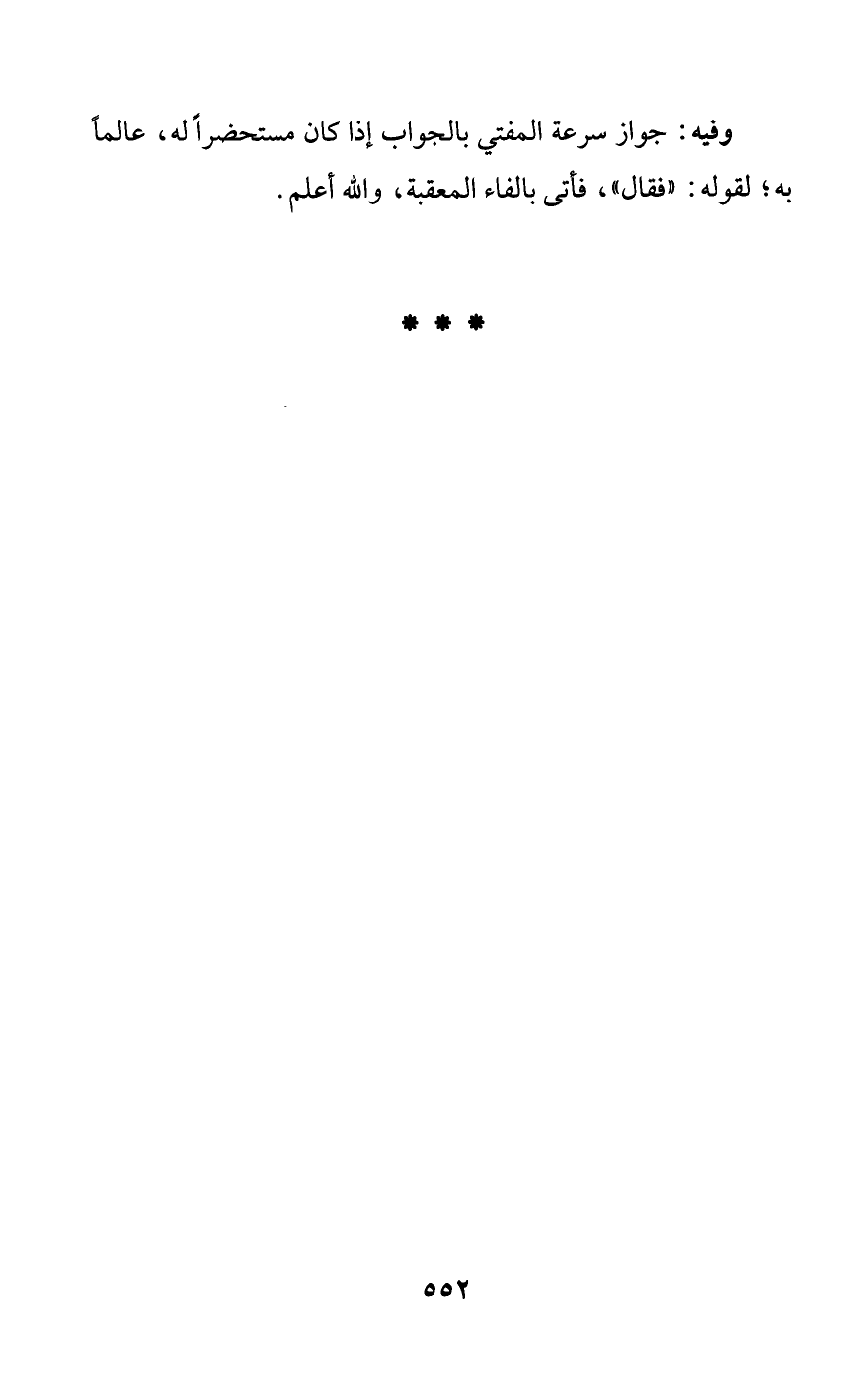 وفيه: جواز سرعة المفتي بالجواب إذا كان مستحضرا له، عالمًا به؛ لقوله: «فقال»، فأتى بالفاء المعقبة، والله أعلم.