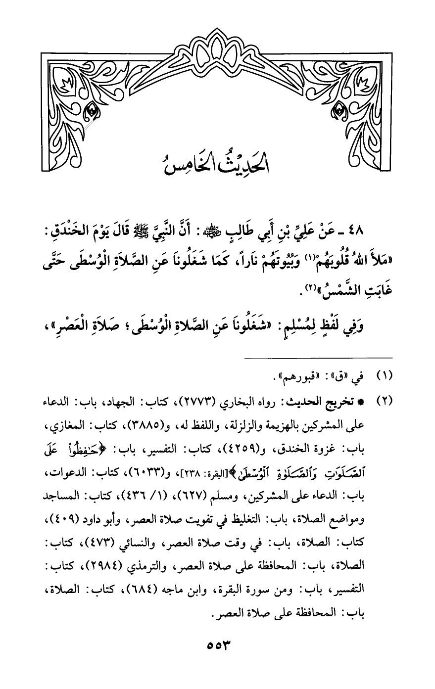 48 - عَنْ عَلِيٍّ بْنُ أَبِي طَالِبٍ - رضي الله عنه -: أَنَّ النَّبِيَّ - صلى الله عليه وسلم - قَالَ يَوْمَ الْخَنْدَقِ: «مَلأَ اللَّهُ قُلُوبَهُمْ (¬1) وَبُيُوتَهُمْ نَارًا, كَمَا شَغَلُونَا عَنْ الصَّلاةِ الْوُسْطَى حَتَّى غَابَتْ الشَّمْسُ» (¬2).
