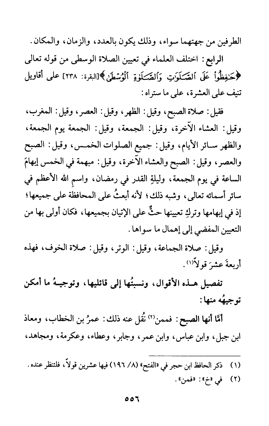 الرابع: اختلف العلماء في تعيين الصلاة الوسطى من قوله تعالى: {حَافِظُوا عَلَى الصَّلَوَاتِ وَالصَّلَاةِ الْوُسْطَى} [البقرة: 238] على أقاويل تنيف على العشرة، على ما ستراه: