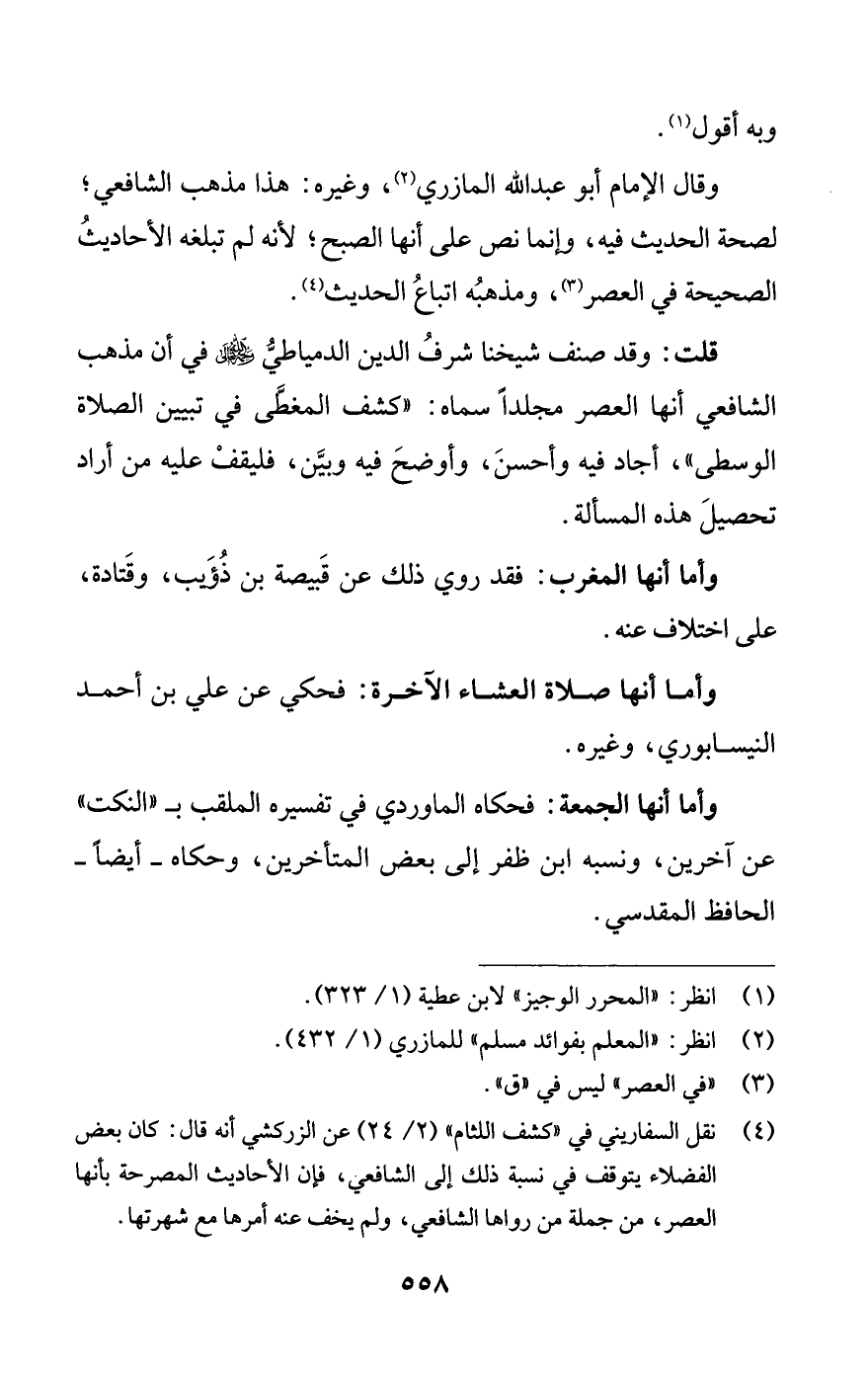 (¬4) نقل السفاريني في كشف اللثام (2/ 24) عن الزركشي أنه قال: كان بعض الفضلاء يتوقف في نسبة ذلك إلى الشافعي، فإن الأحاديث المصرحة بأنها العصر، من جملة من رواها الشافعي، ولم يخف عنه أمرها مع شهرتها.