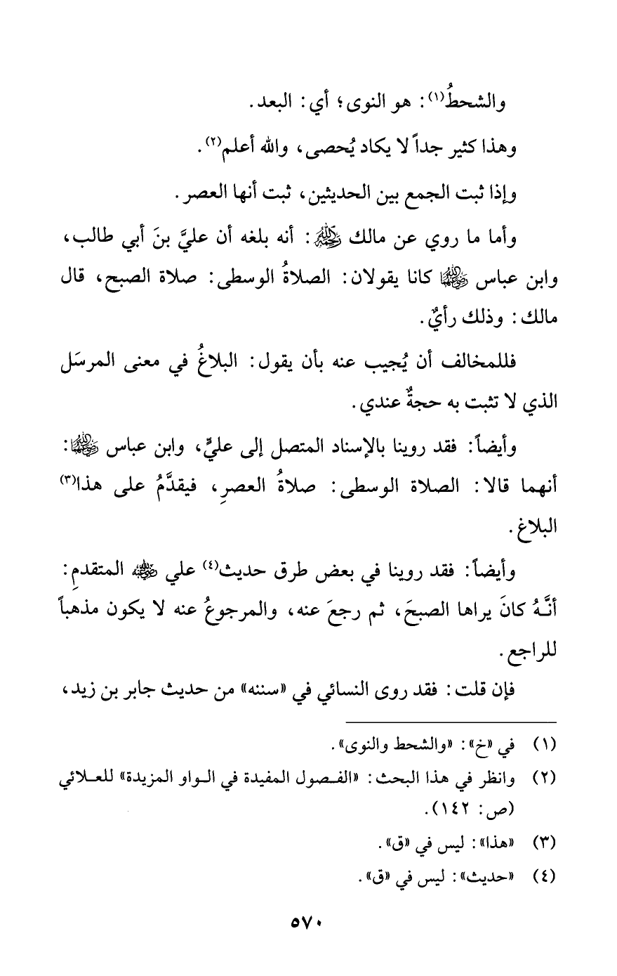 وأيضا: فقد روينا بالإسناد المتصل إلى علي، وابن عباس -رضي الله عنهما- أنهما قالا: الصلاة الوسطى: صلاة العصر، فيقدم على هذا (¬3) البلاغ.